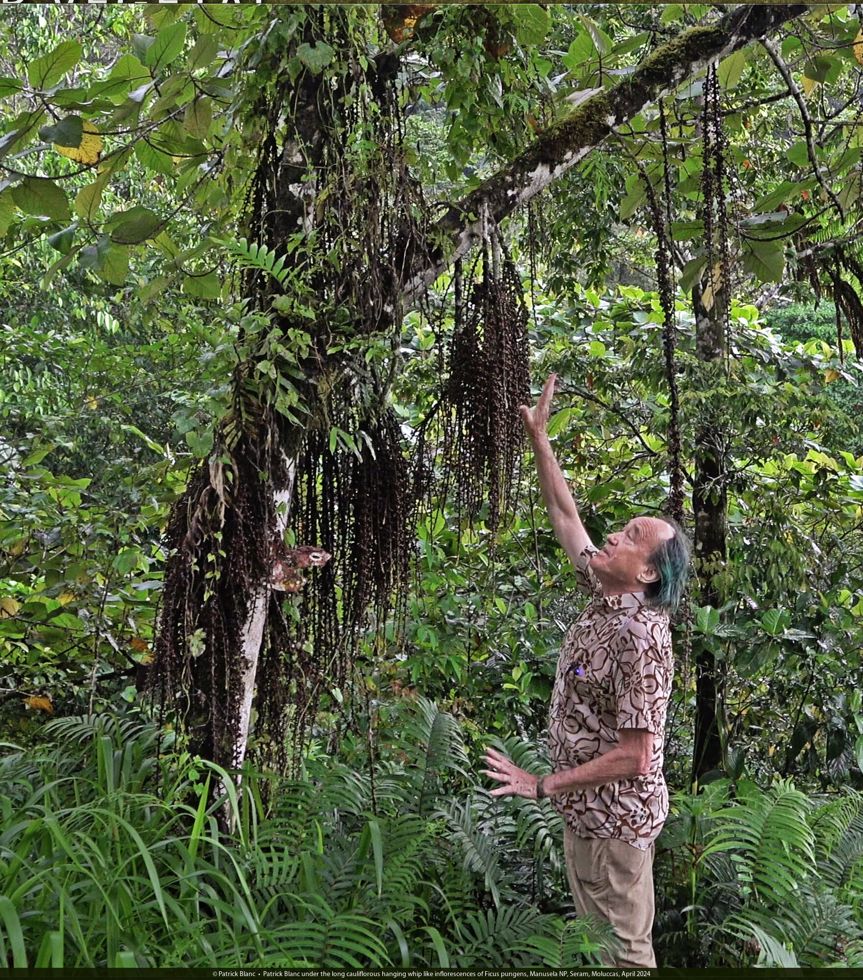 Patrick Blanc under the long cauliflorous hanging whip like inflorescences of Ficus pungens, Manusela NP, Seram, Moluccas, April 2024