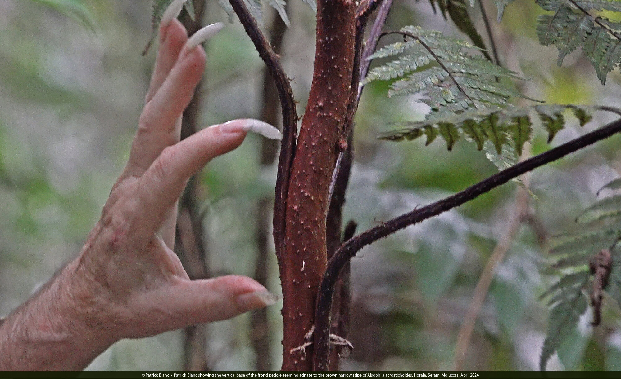 Patrick Blanc showing the vertical base of the frond petiole seeming adnate to the brown narrow stipe of Alsophila acrostichoides, Horale, Seram, Moluccas, April 2024