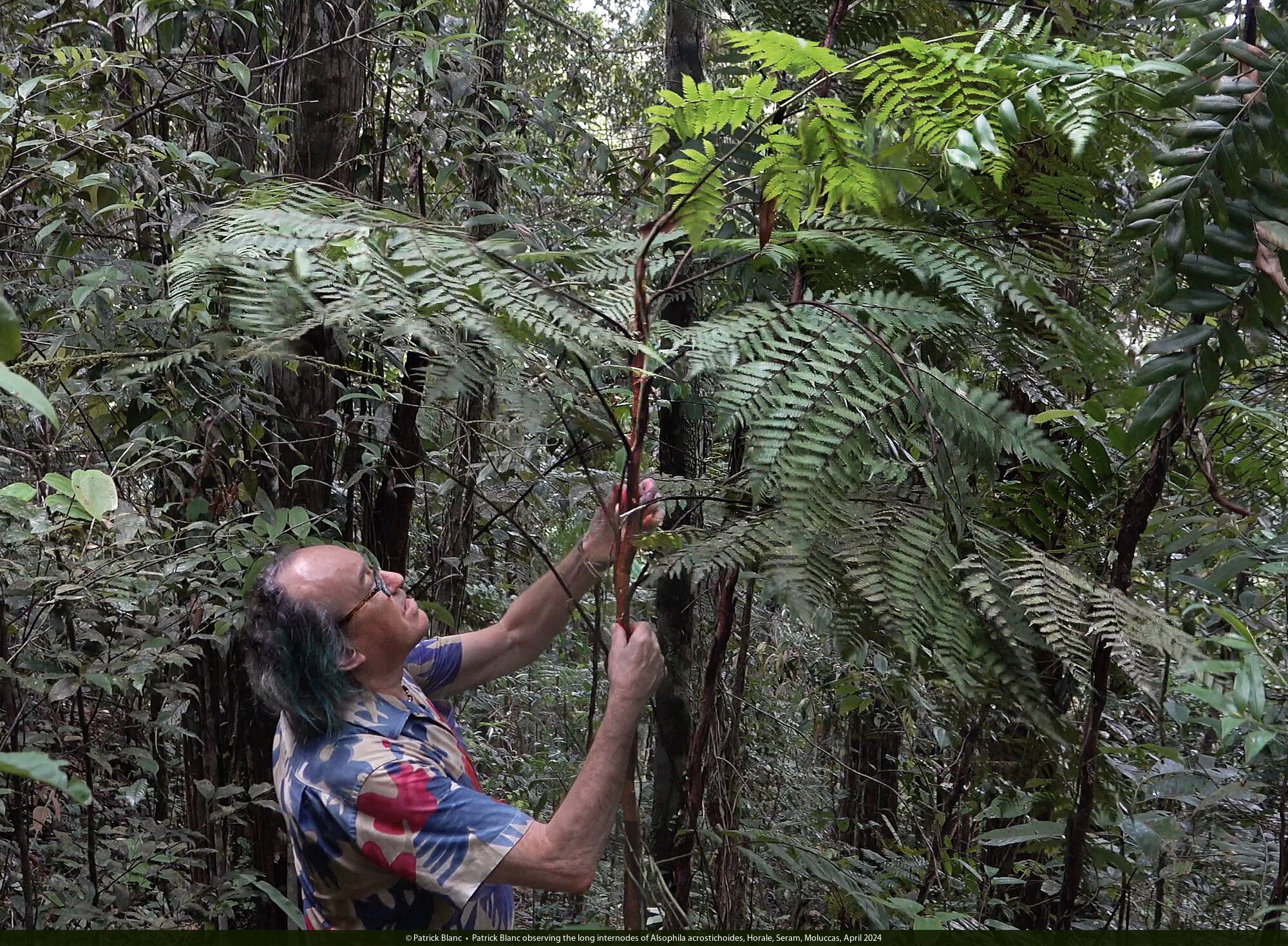 Patrick Blanc observing the long internodes of Alsophila acrostichoides, Horale, Seram, Moluccas, April 2024