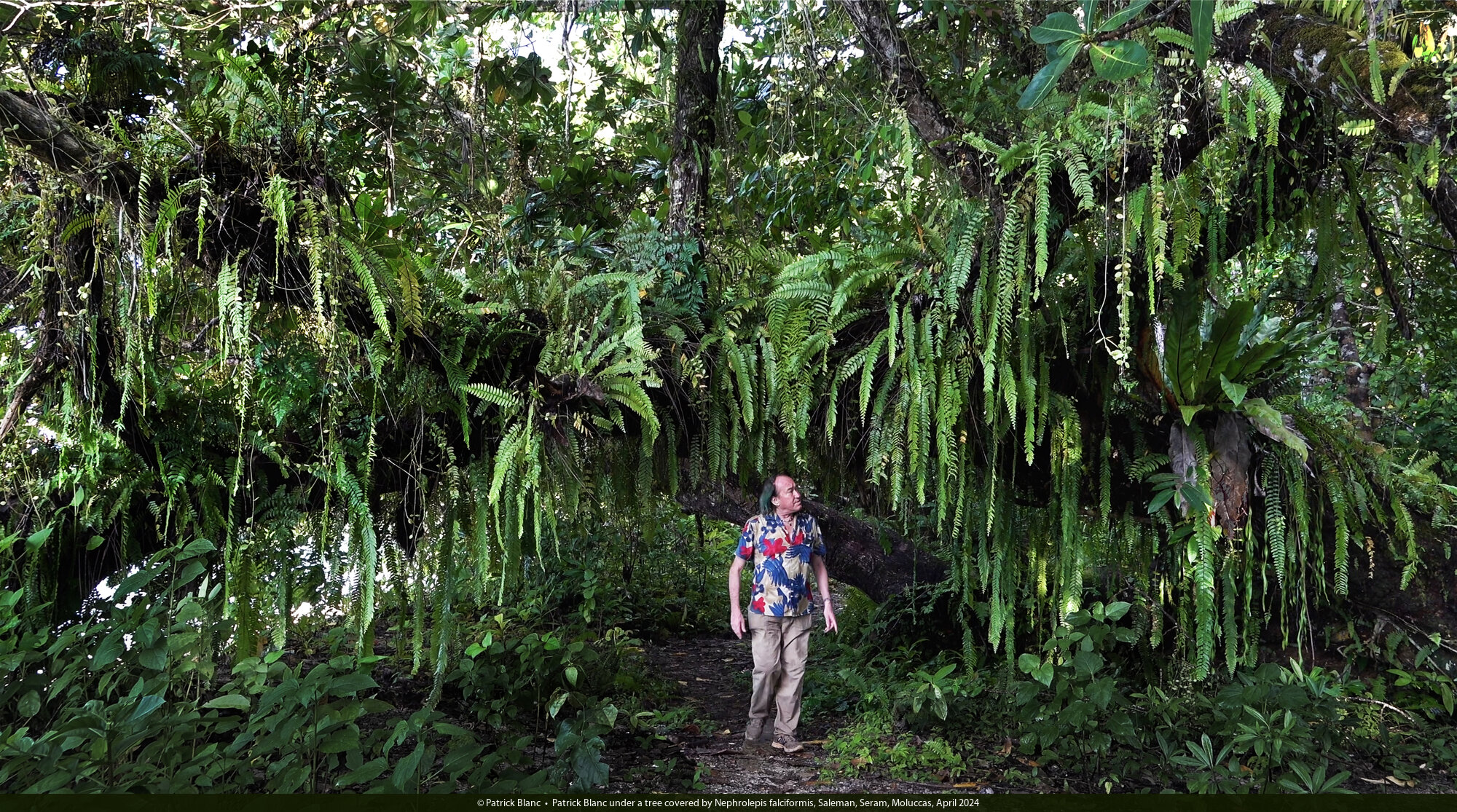 Patrick Blanc under a tree covered by Nephrolepis falciformis, Saleman, Seram, Moluccas, April 2024