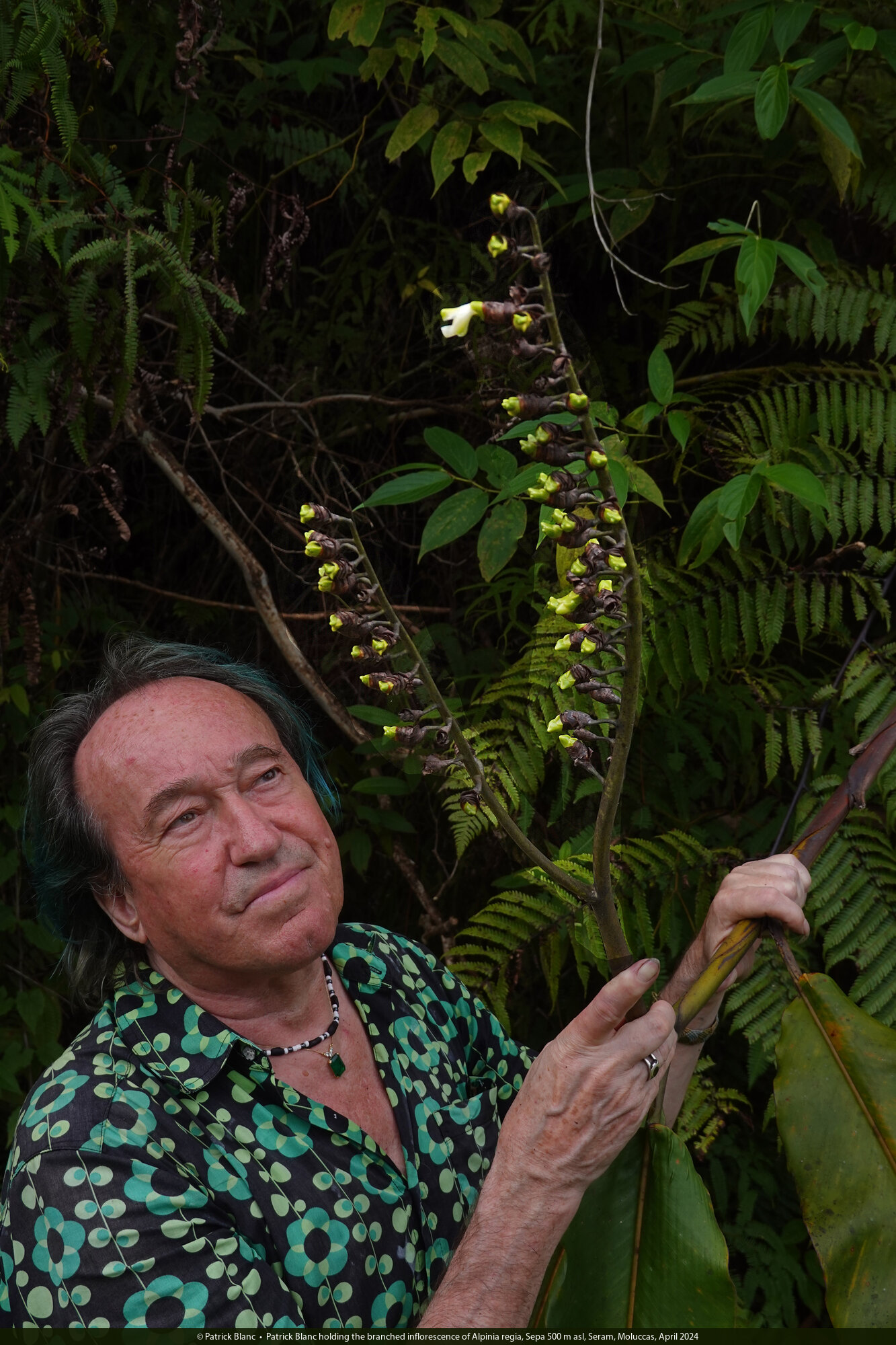 Patrick Blanc holding the branched inflorescence of Alpinia regia, Sepa 500 m asl, Seram, Moluccas, April 2024