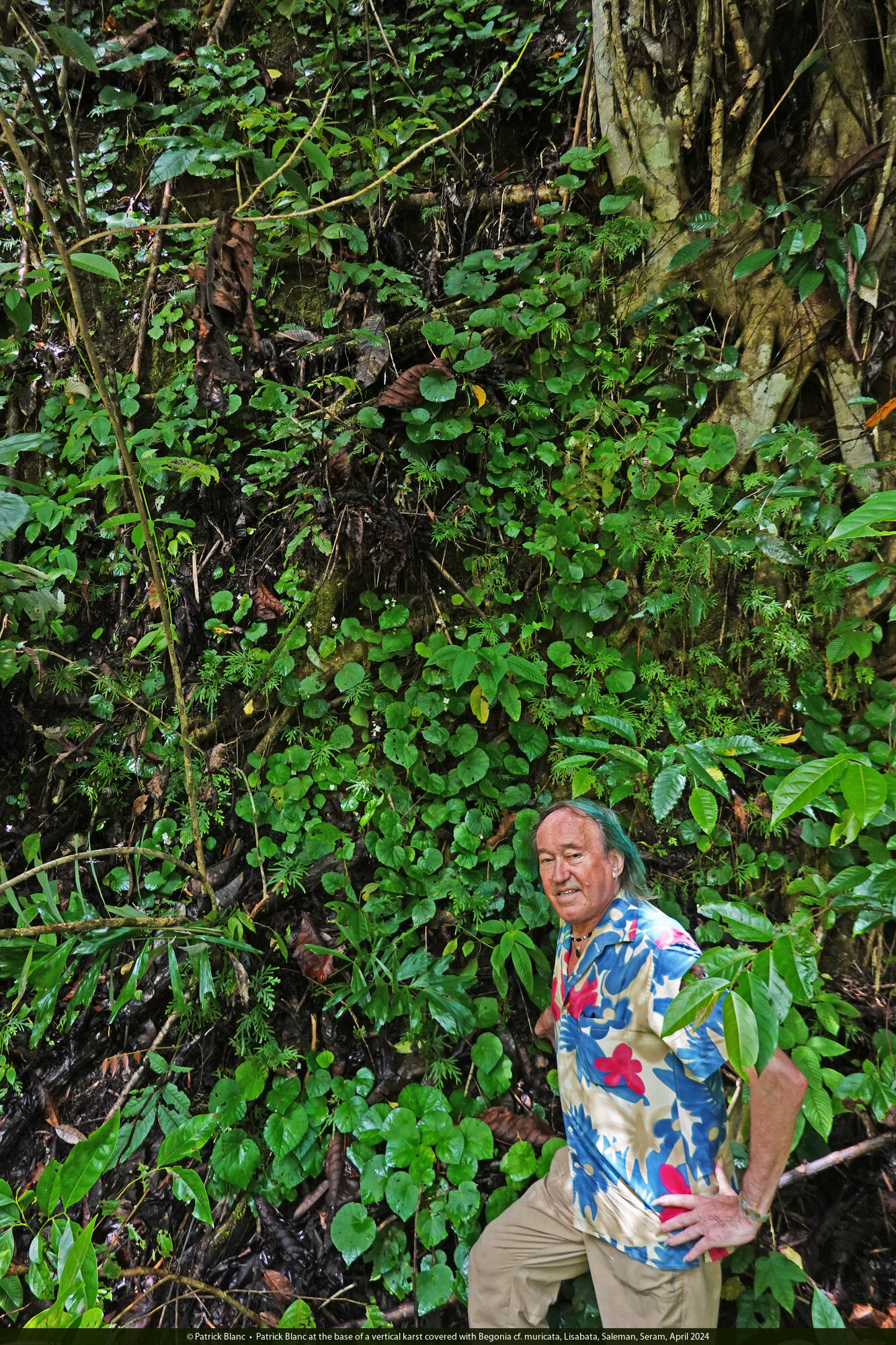 Patrick Blanc at the base of a vertical karst covered with Begonia cf. muricata, Lisabata, Saleman, Seram, April 2024