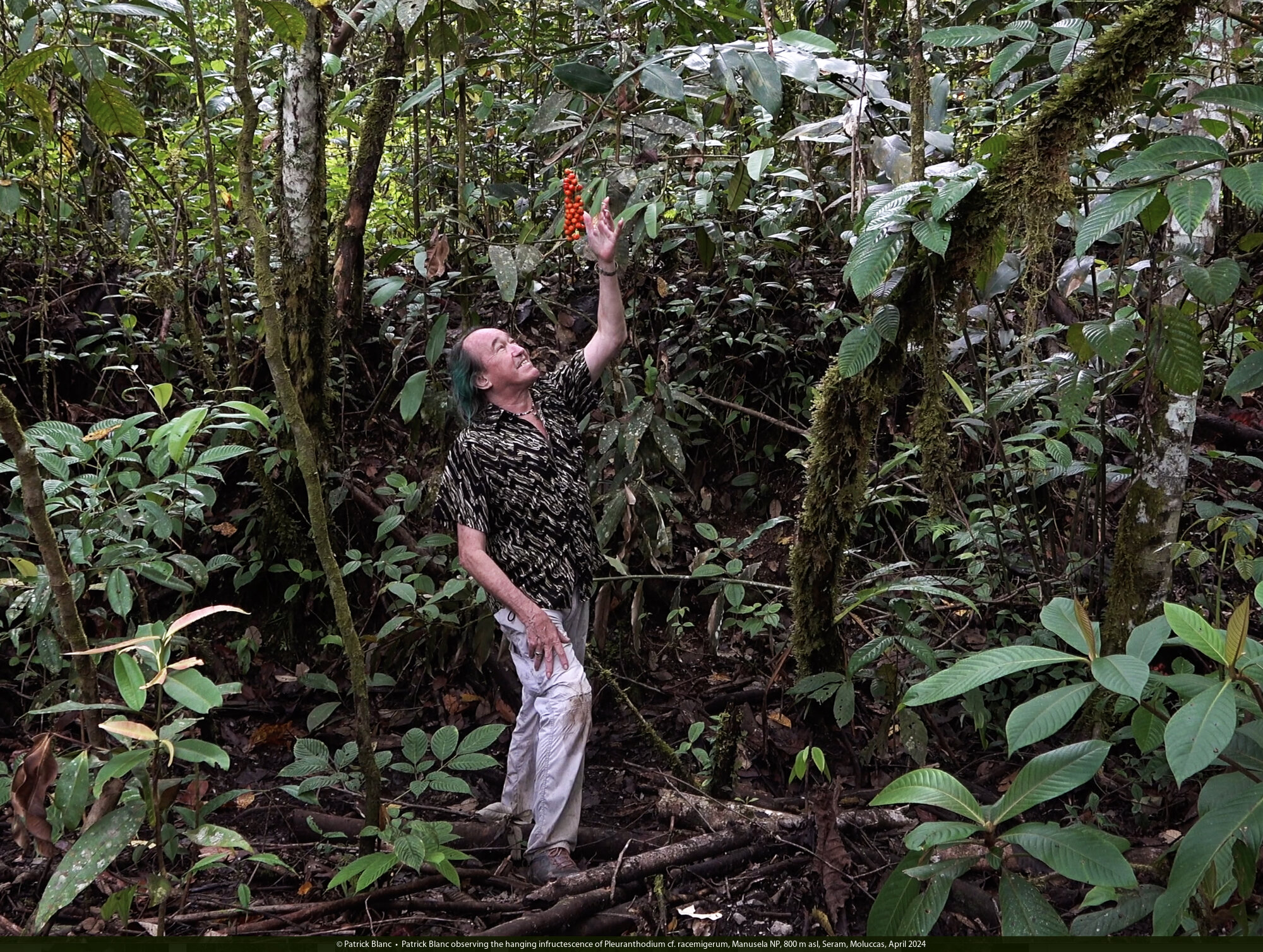 Patrick Blanc observing the hanging infructescence of Pleuranthodium cf. racemigerum, Manusela NP, 800 m asl, Seram, Moluccas, April 2024