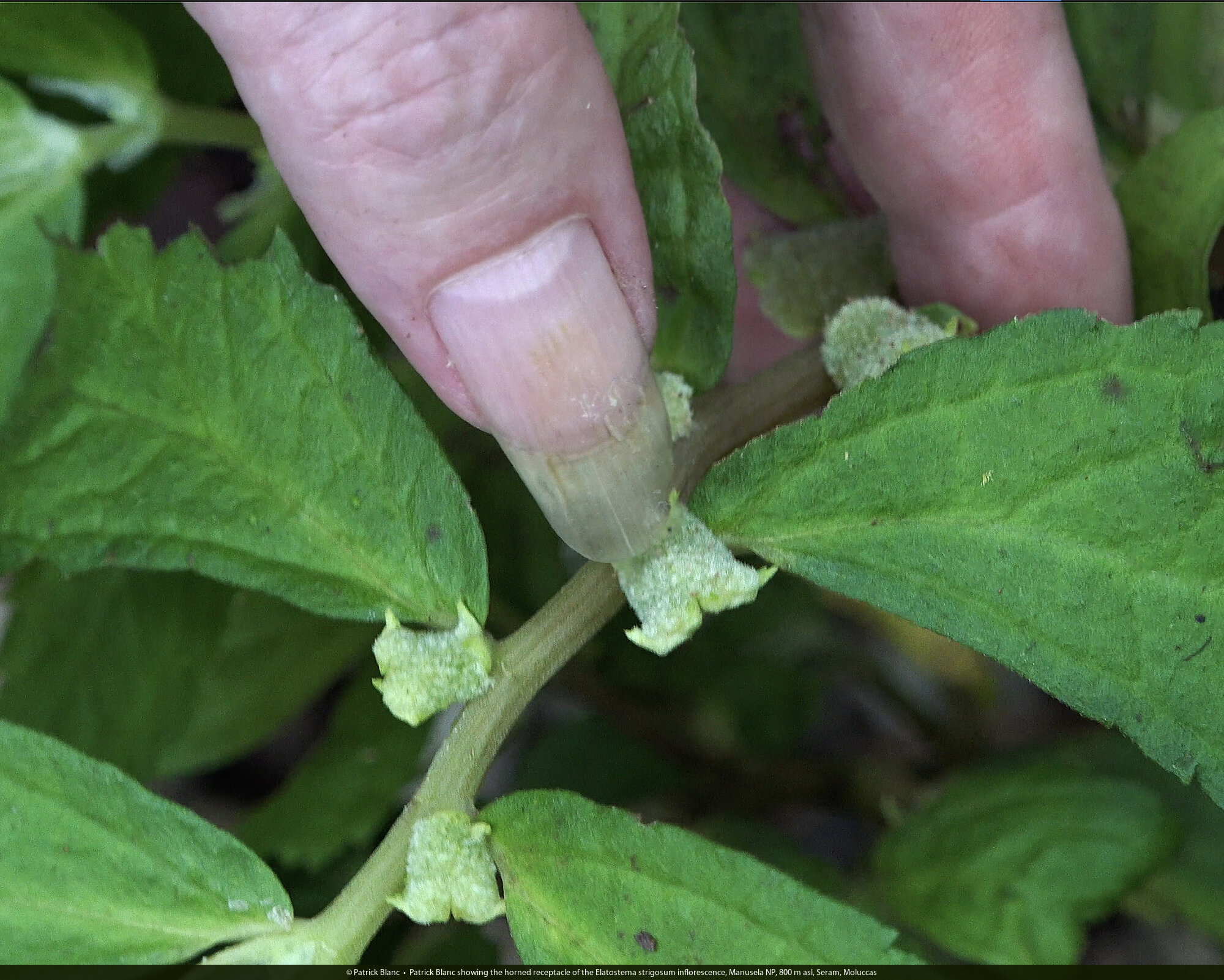 Patrick Blanc showing the horned receptacle of the Elatostema strigosum inflorescence, Manusela NP, 800 m asl, Seram, Moluccas