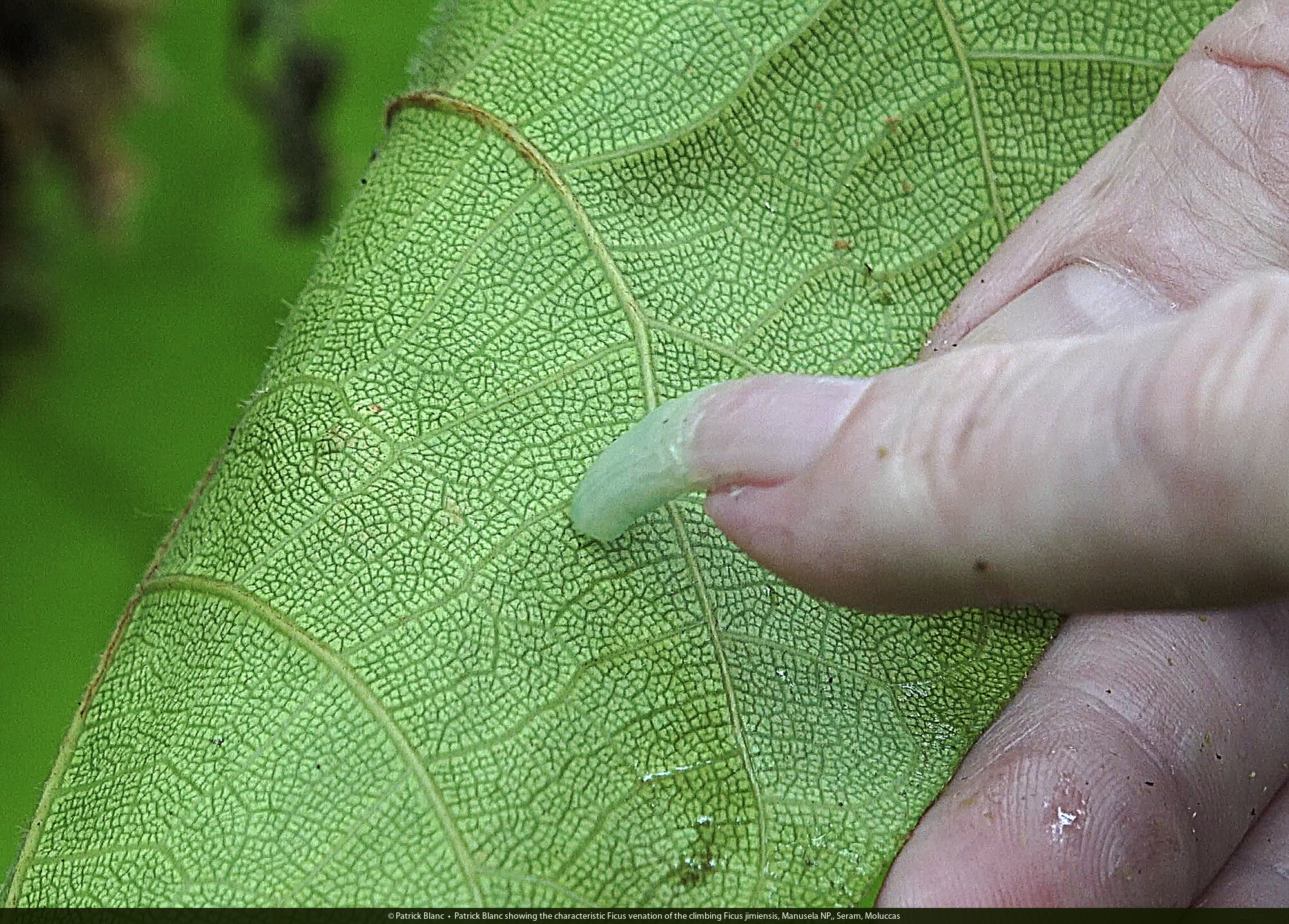 Patrick Blanc showing the characteristic Ficus venation of the climbing Ficus jimiensis, Manusela NP,, Seram, Moluccas