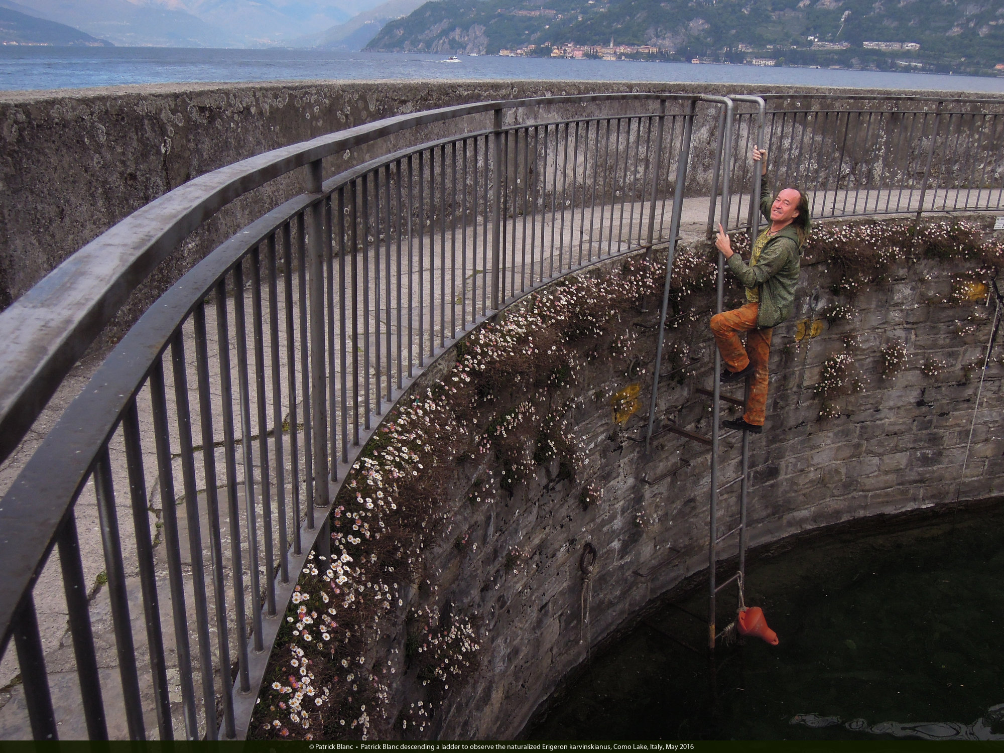 Patrick Blanc descending a ladder to observe the naturalized Erigeron karvinskianus, Como Lake, Italy, May 2016