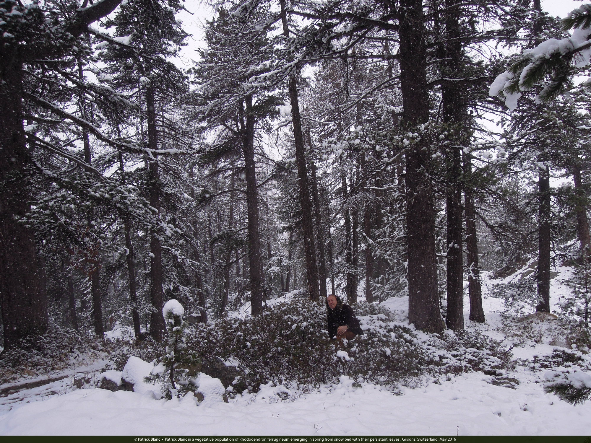Patrick Blanc climbing on a forest understory snowy slope covered by Rhododendron ferrugineum, Grisons, Switzerland, May 2016
