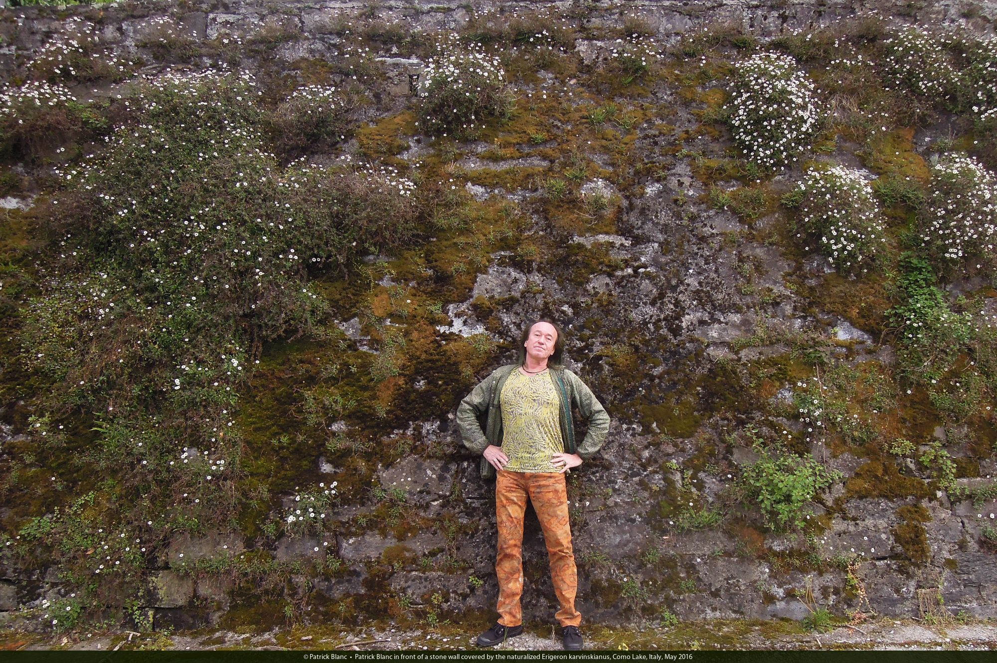 Patrick Blanc in front of a stone wall covered by the naturalized Erigeron karvinskianus, Como Lake, Italy, May 2016