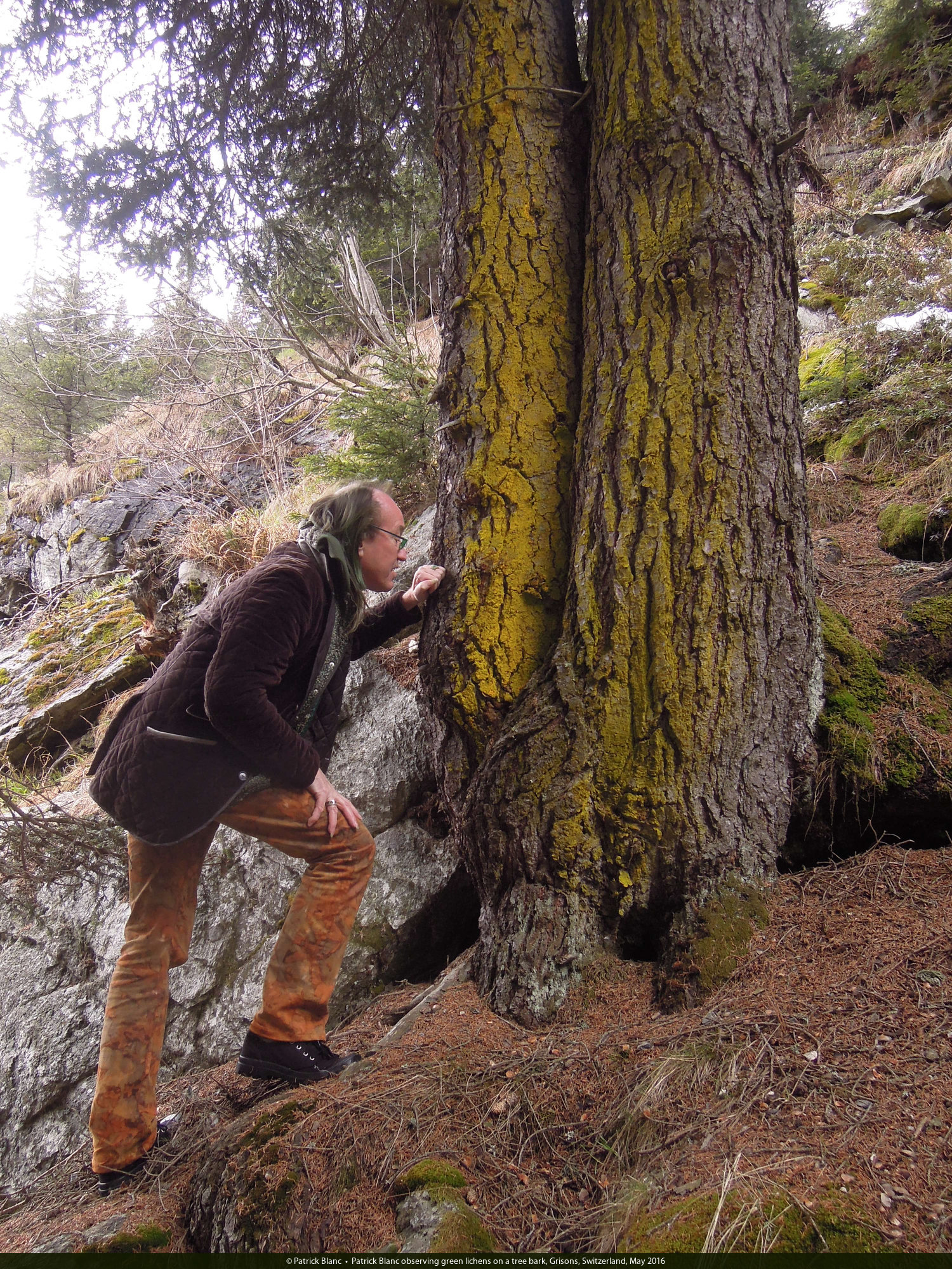 Patrick Blanc observing green lichens on a tree bark, Grisons, Switzerland, May 2016