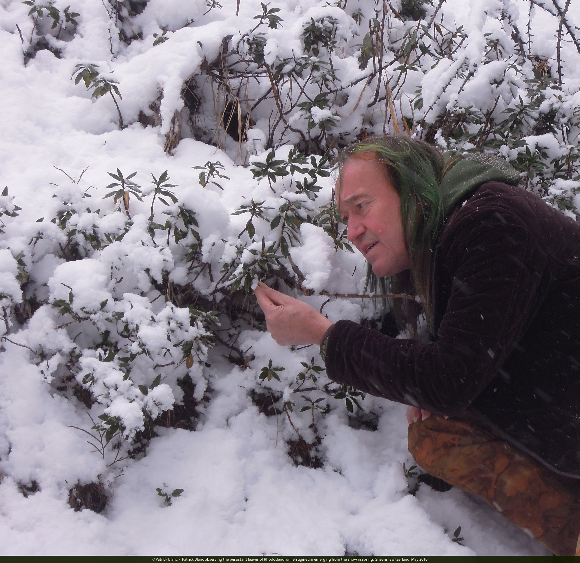 Patrick Blanc observing the persistant leaves of Rhododendron ferrugineum emerging from the snow in spring, Grisons, Switzerland, May 2016
