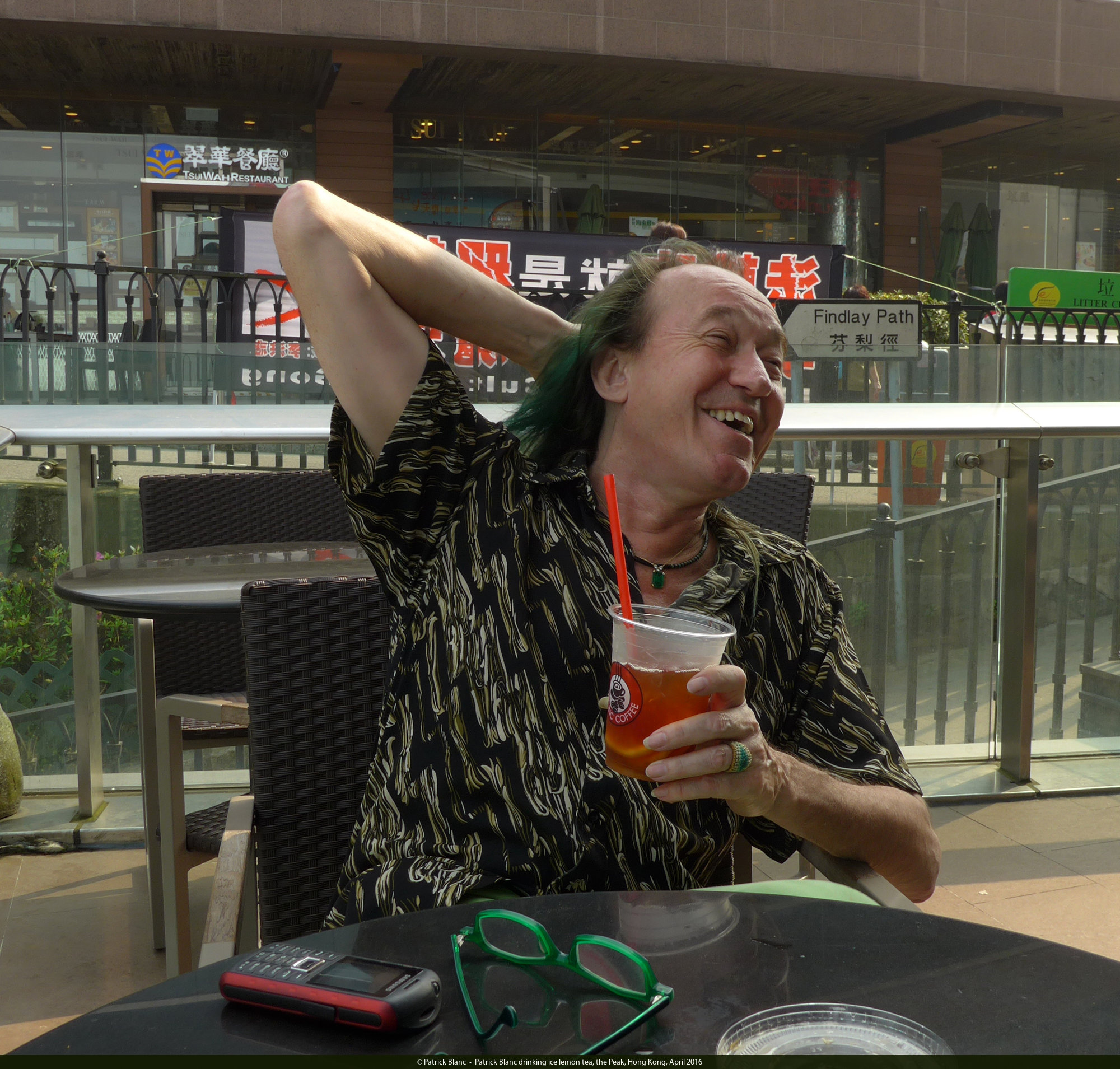 Patrick Blanc drinking ice lemon tea, the Peak, Hong Kong, April 2016