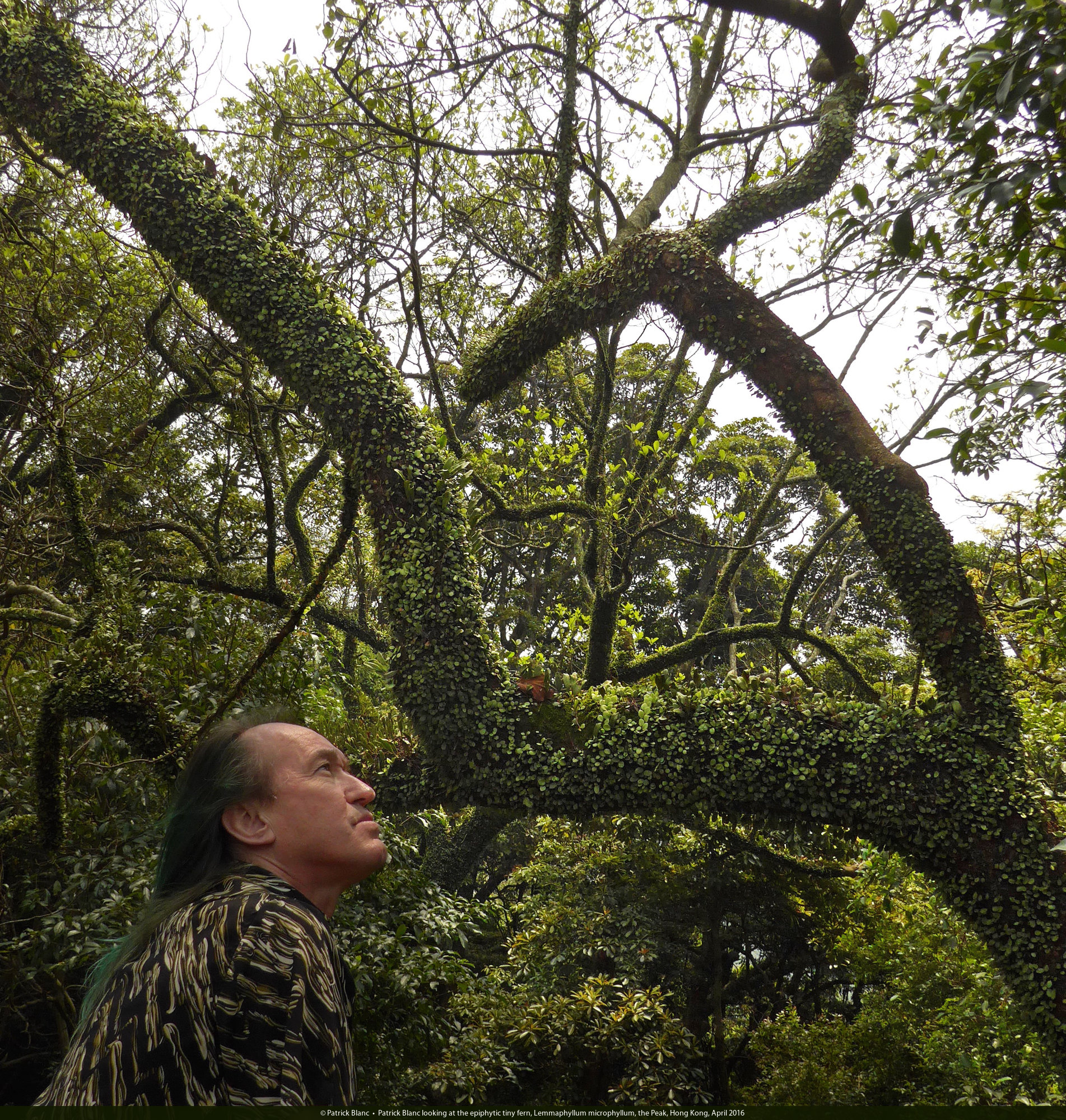 Patrick Blanc looking at the epiphytic tiny fern, Lemmaphyllum microphyllum, the Peak, Hong Kong, April 2016