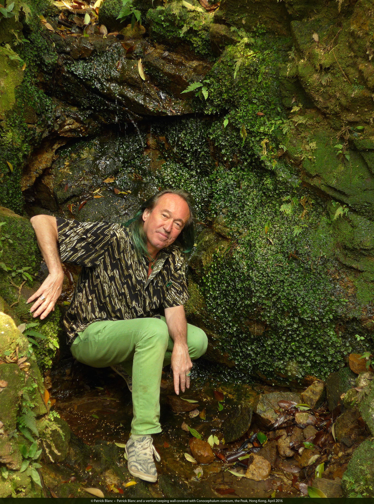 Patrick Blanc and a vertical seeping wall covered with Conocephalum conicum, the Peak, Hong Kong, April 2016