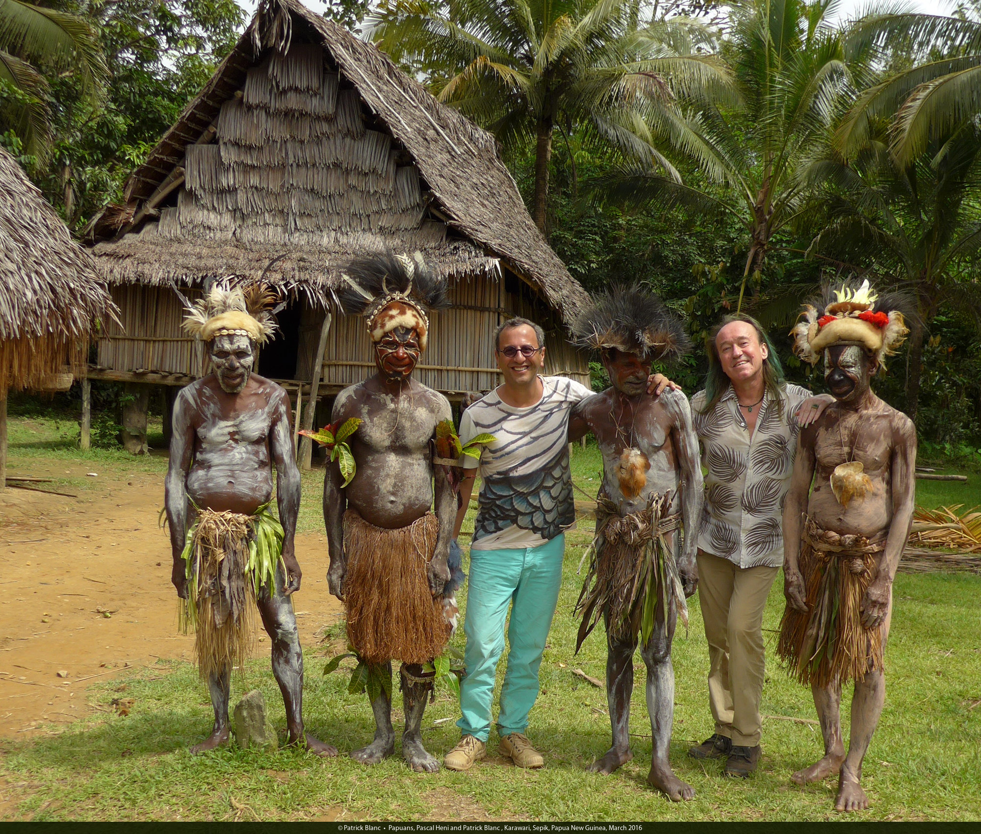 Patrick Blanc and Pascal Heni in front of the Men house, Karawari, Sepik, Papua New Guinea, March 2016