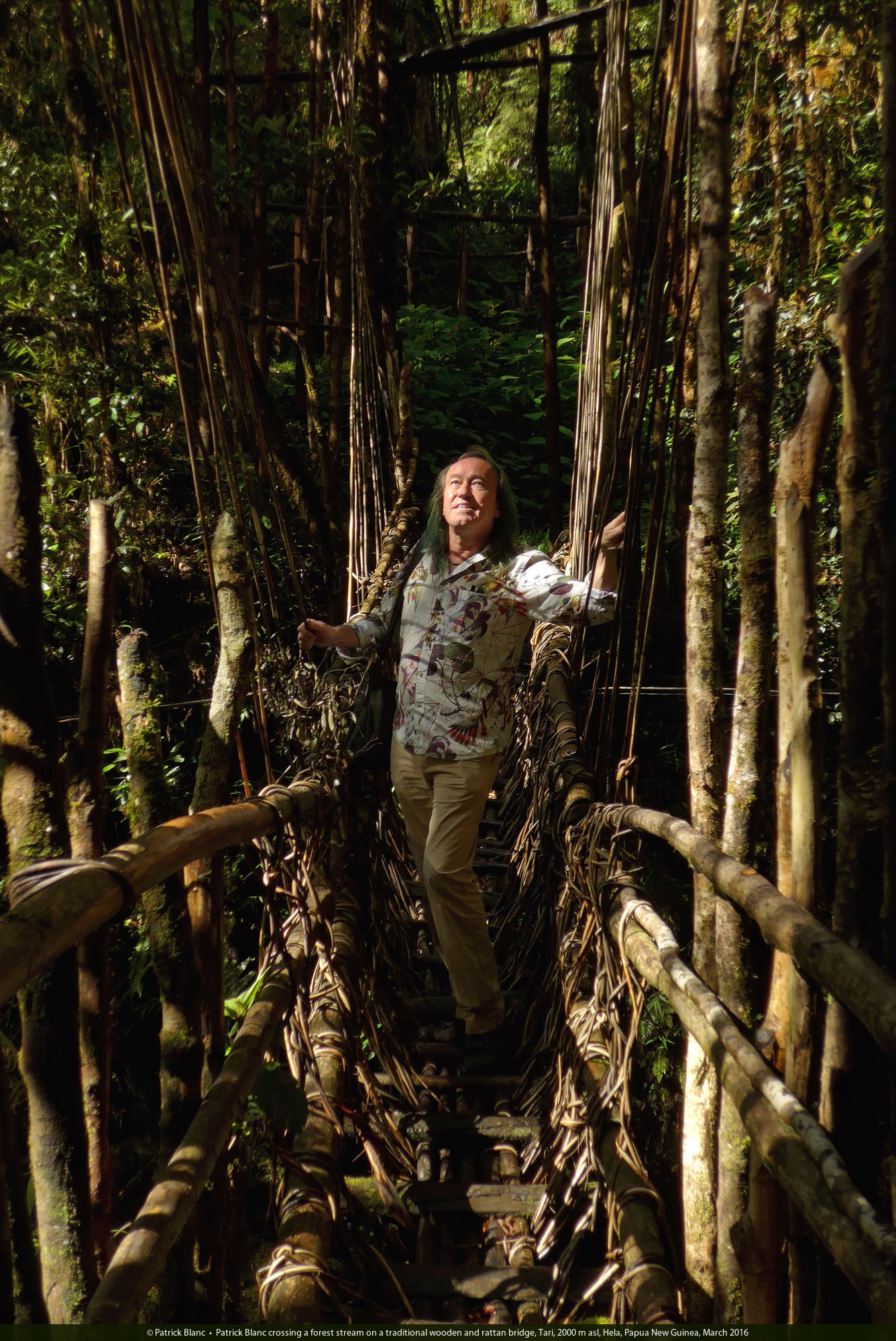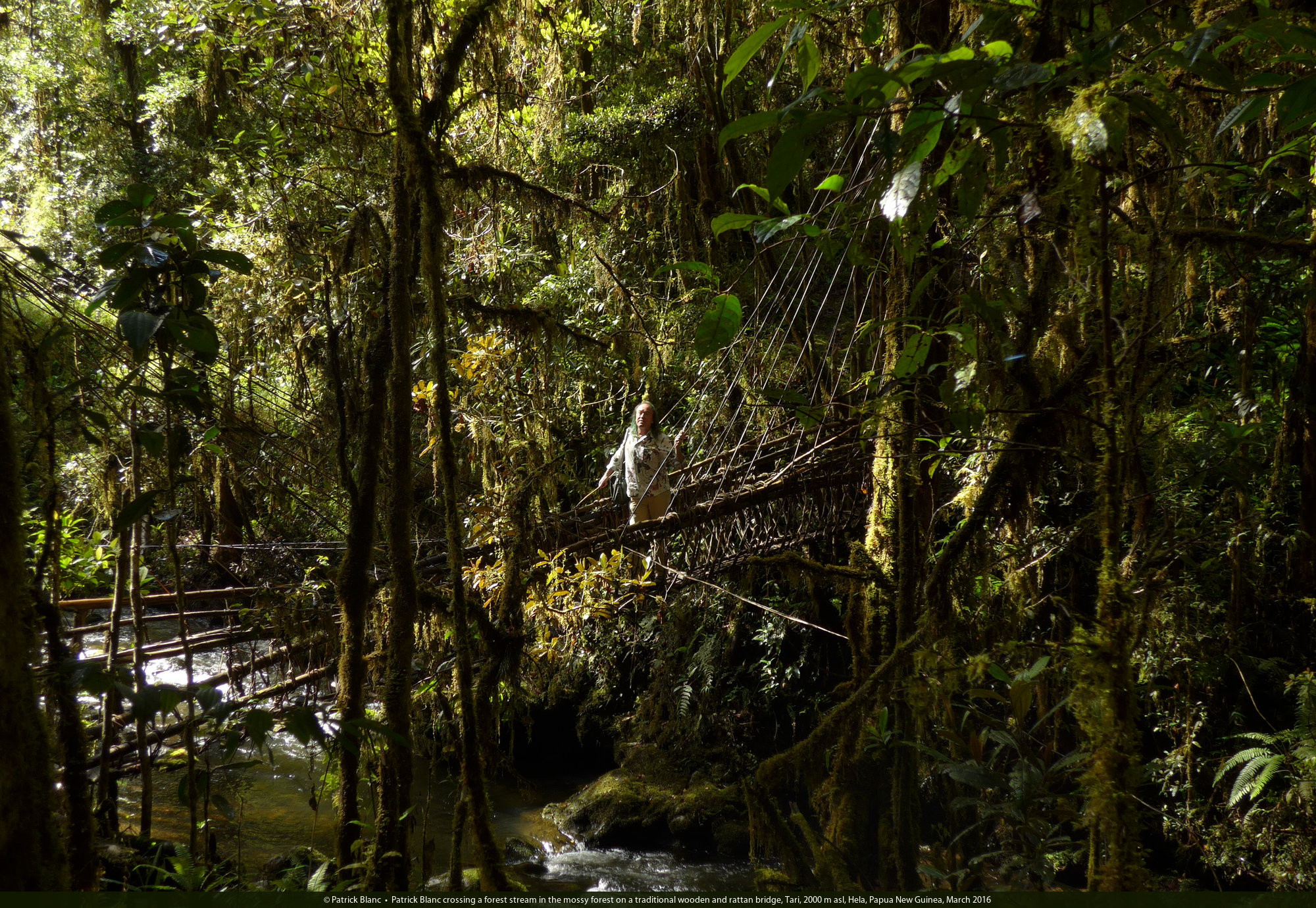 Patrick Blanc crossing a forest stream on a traditional wooden and rattan bridge, Tari, 2000 m asl, Hela, Papua New Guinea, March 2016