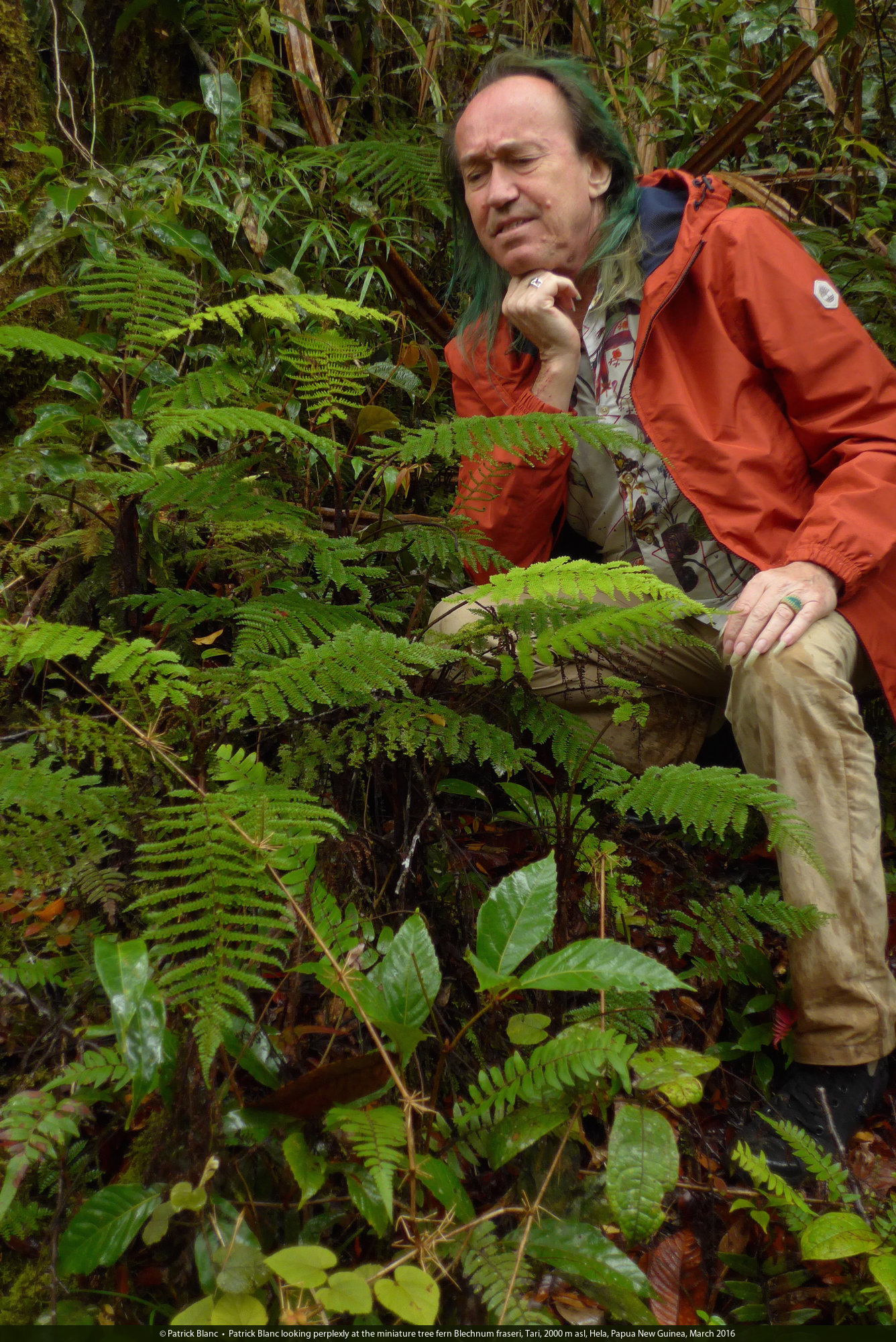 Patrick Blanc looking perplexly at the miniature tree fern Alsophila perpelvigera, Tari, 2000 m asl, Hela, Papua New Guinea, March 2016