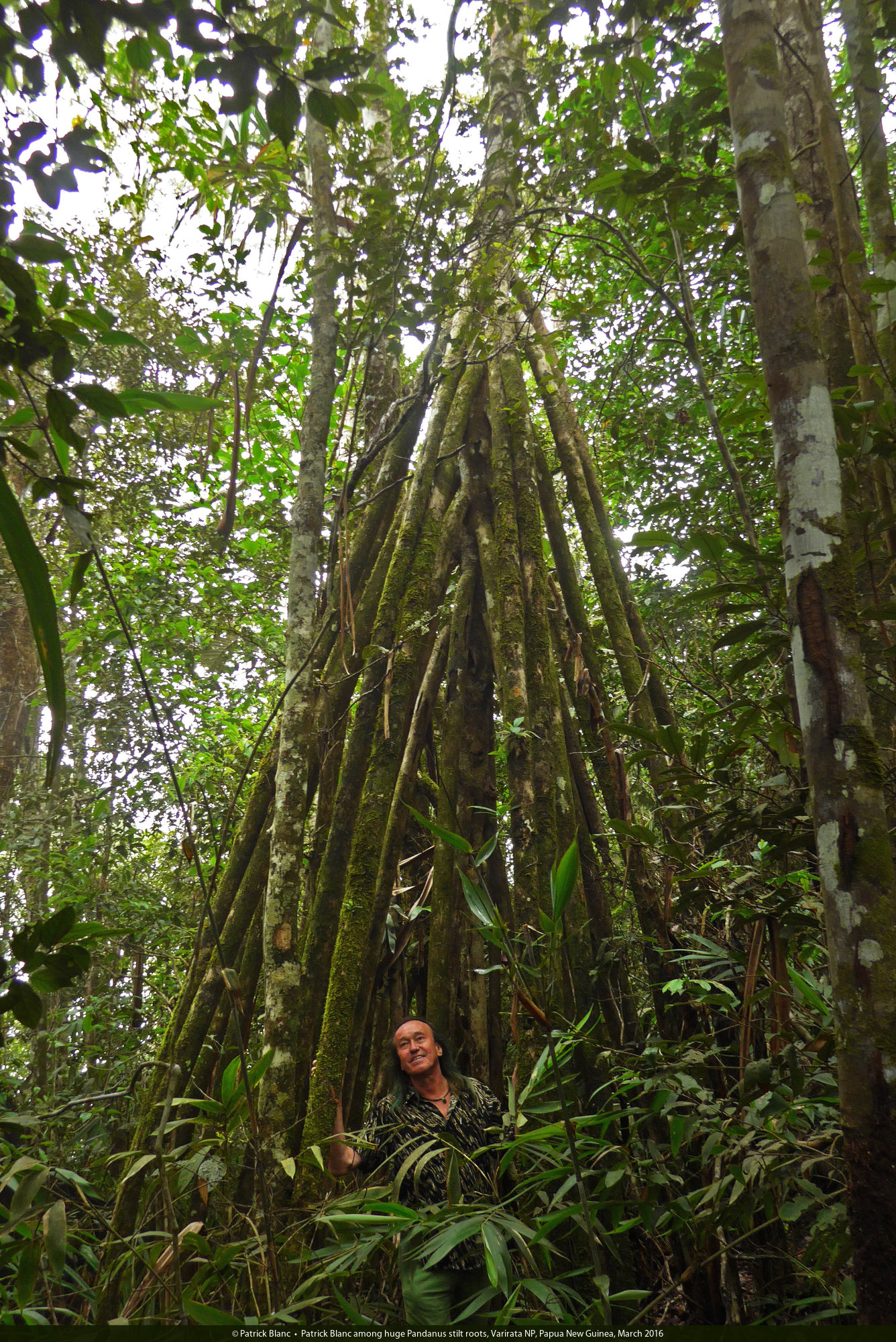 Patrick Blanc among huge Pandanus papuanus stilt roots, Varirata NP, Papua New Guinea, March 2016