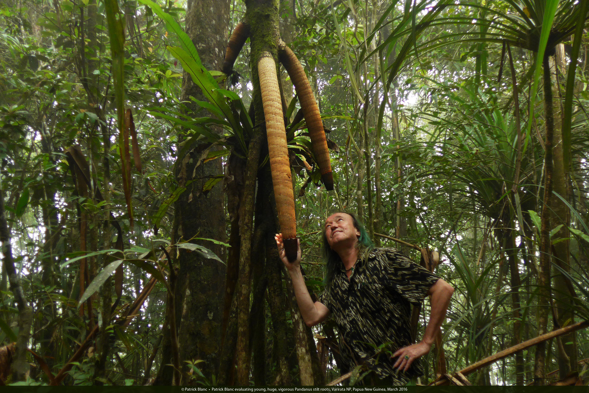 Patrick Blanc evaluating young, huge, vigorous Pandanus papuanus stilt roots, Varirata NP, Papua New Guinea, March 2016