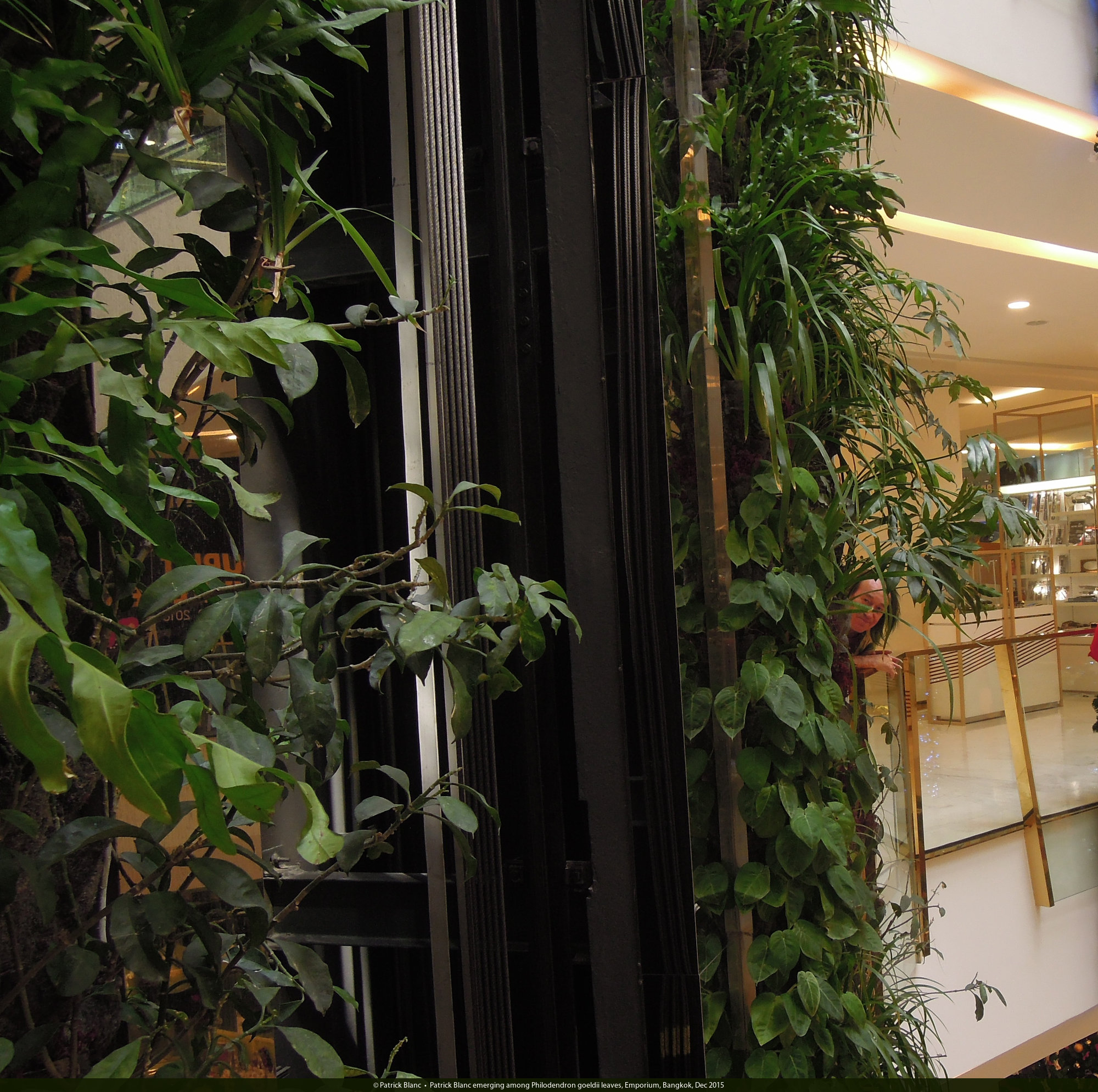 Patrick Blanc emerging among Philodendron goeldii leaves, Emporium, Bangkok, Dec 2015