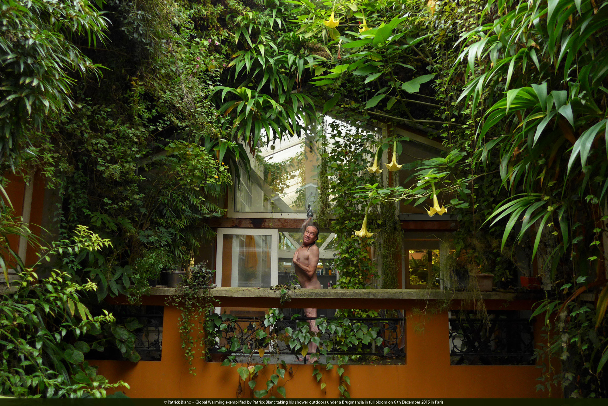 Global Warming exemplified by Patrick Blanc taking his shower outdoors under a Brugmansia in full bloom on 6 th December 2015 in Paris
