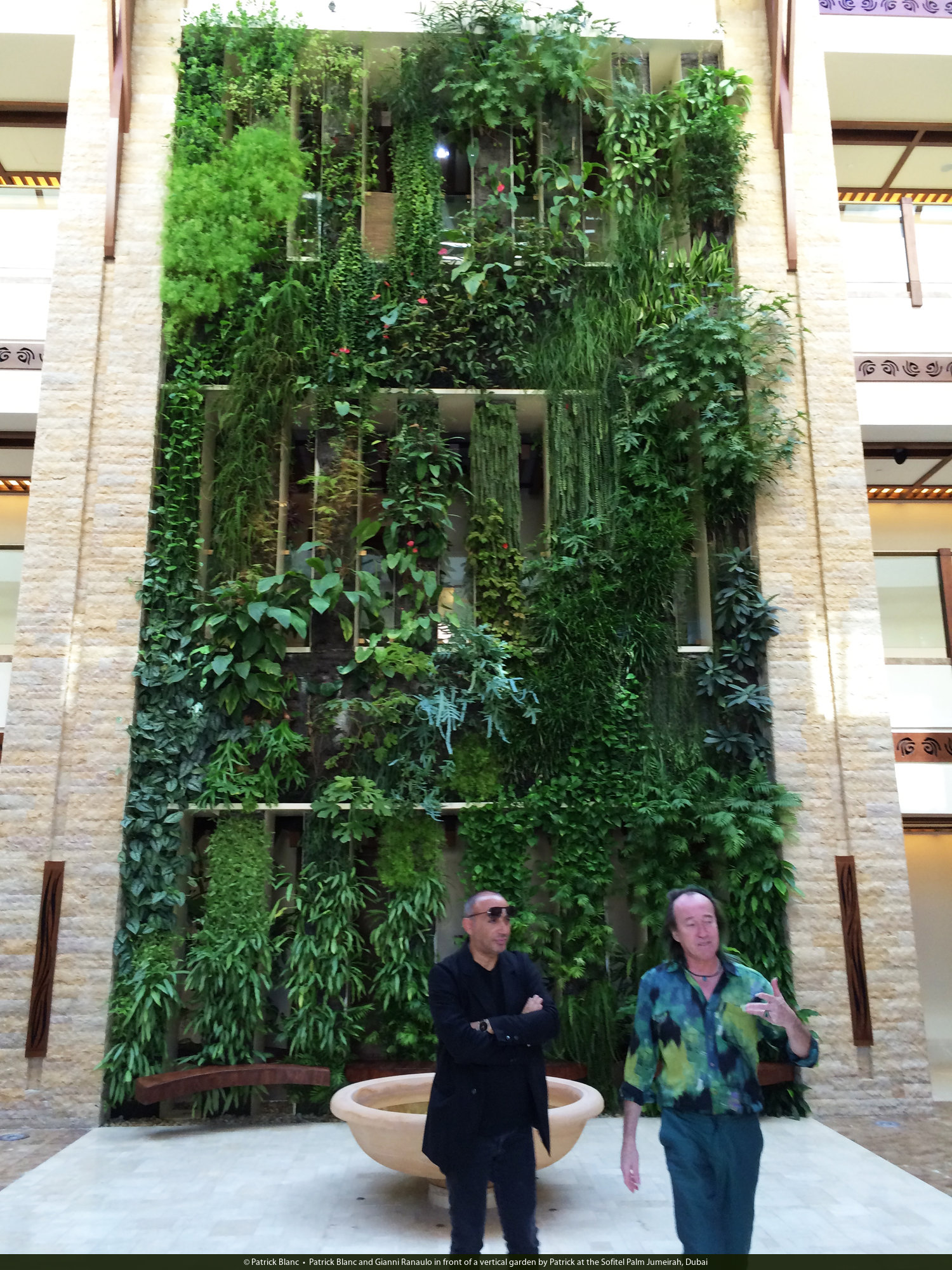 Patrick Blanc and Gianni Ranaulo in front of a vertical garden by Patrick at the Sofitel Palm Jumeirah, Dubai