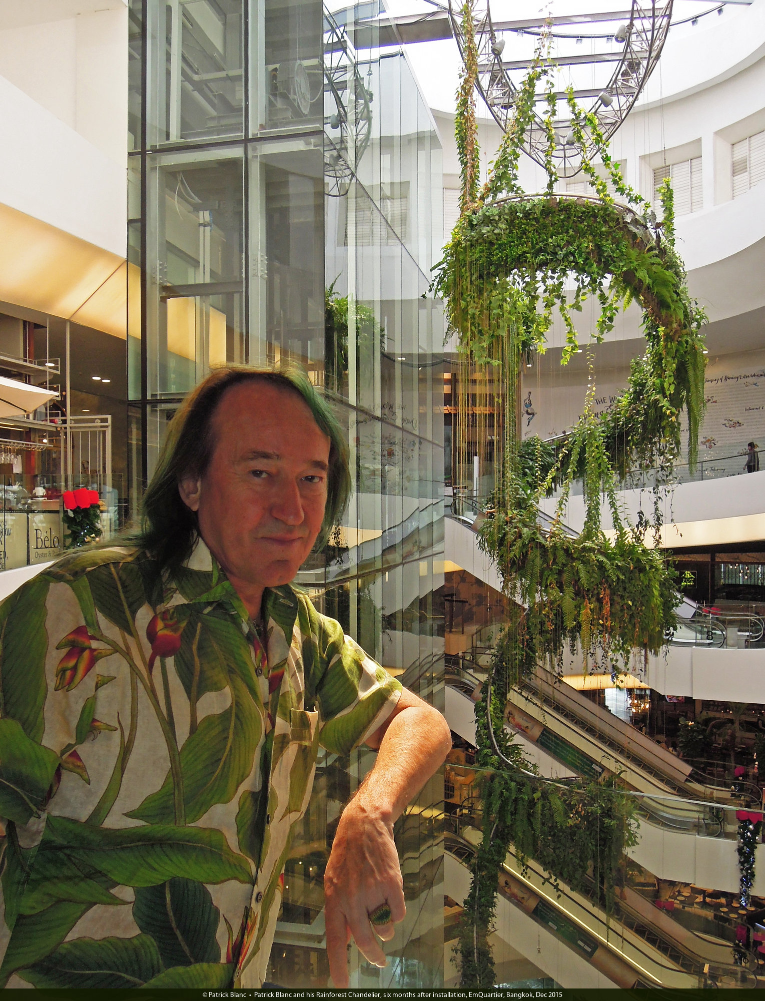 Patrick Blanc and his Rainforest Chandelier, six months after installation, EmQuartier, Bangkok, Dec 2015