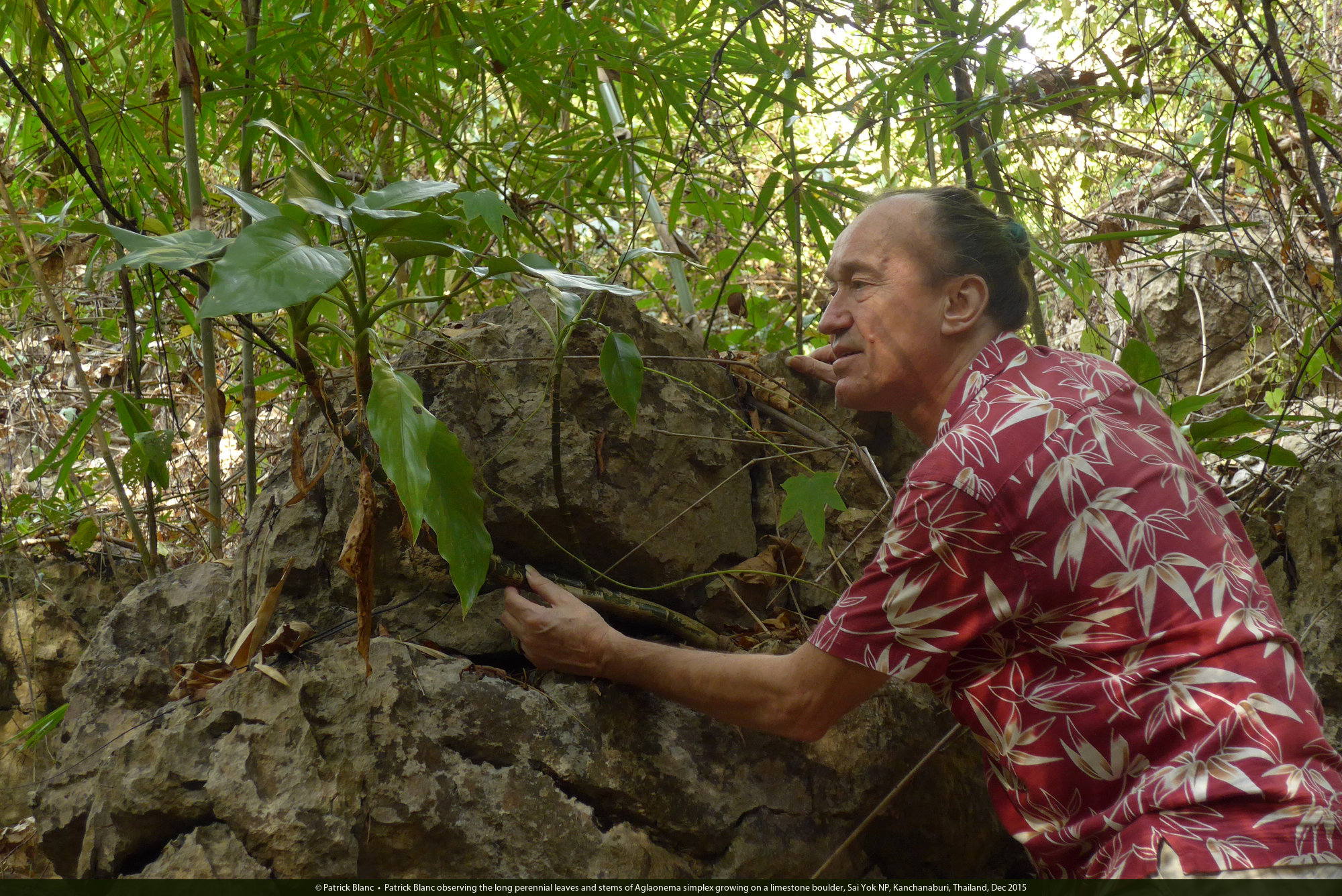Patrick Blanc observing the long perennial leaves and stems of Aglaonema simplex growing on a limestone boulder, Sai Yok NP, Kanchanaburi, Thailand, Dec 2015