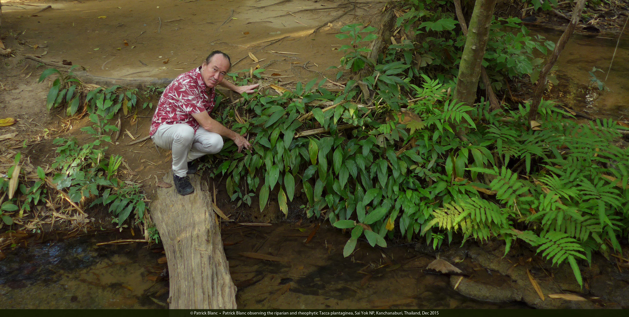 Patrick Blanc observing the riparian and rheophytic Tacca plantaginea, Sai Yok NP, Kanchanaburi, Thailand, Dec 2015