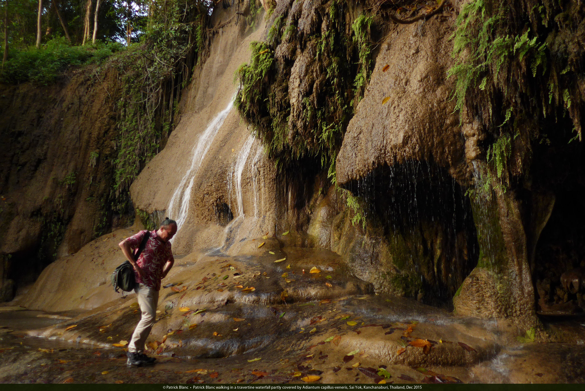 Patrick Blanc walking in a travertine waterfall partly covered by Adiantum capillus-veneris, Sai Yok, Kanchanaburi, Thailand, Dec 2015