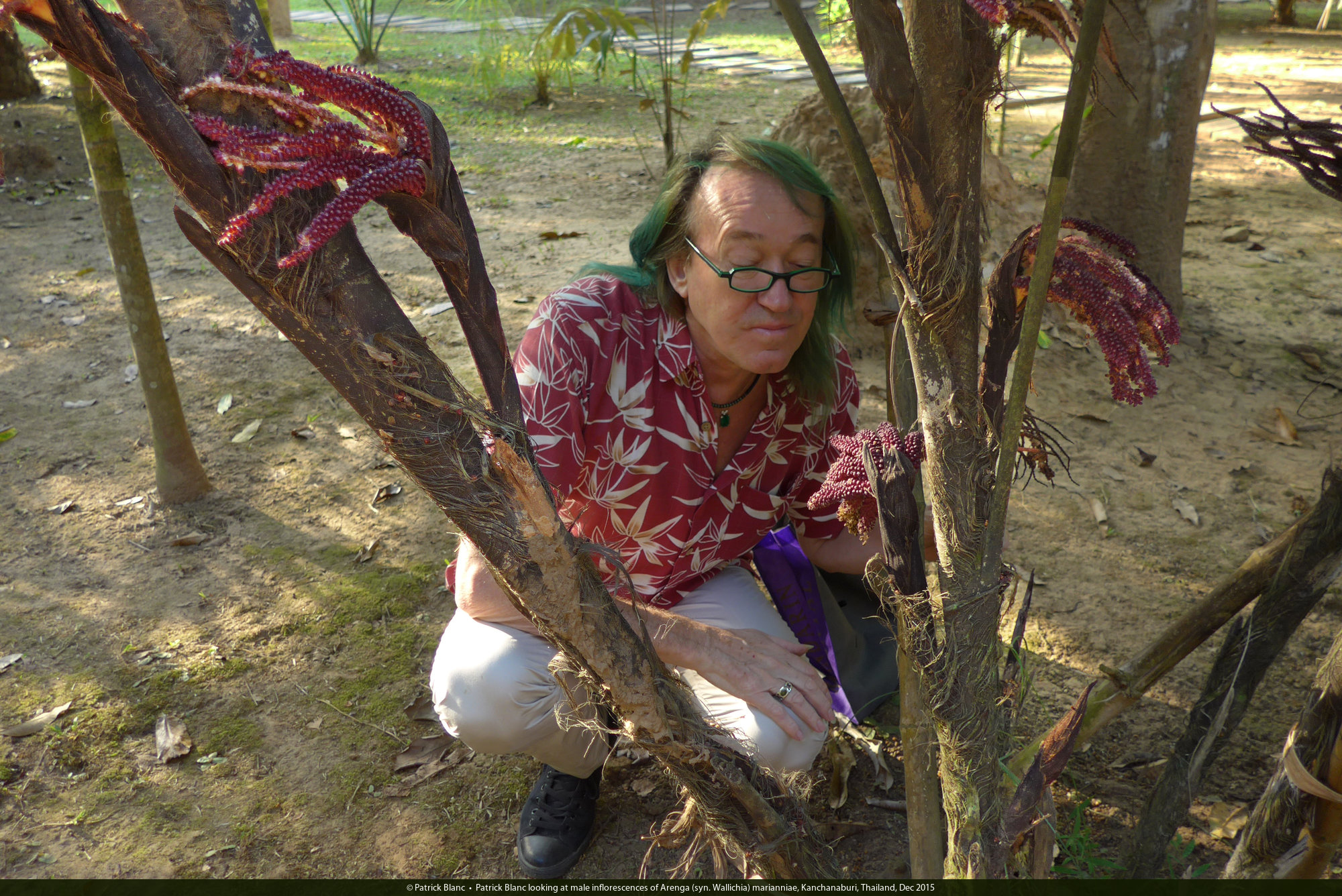 Patrick Blanc looking at male inflorescences of Arenga (syn. Wallichia) marianniae, Kanchanaburi, Thailand, Dec 2015