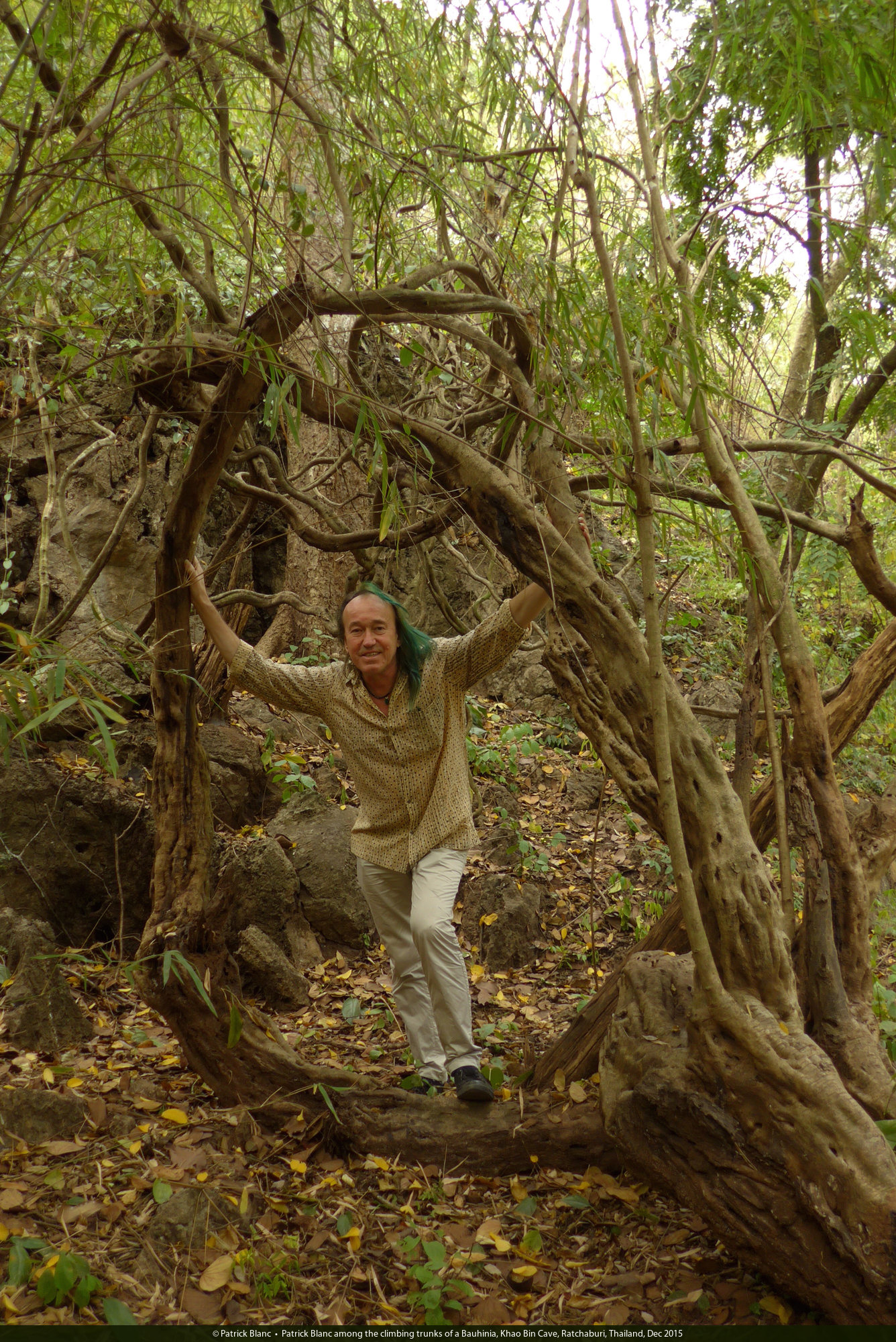 Patrick Blanc among the climbing trunks of a Bauhinia, Khao Bin Cave, Ratchaburi, Thailand, Dec 2015