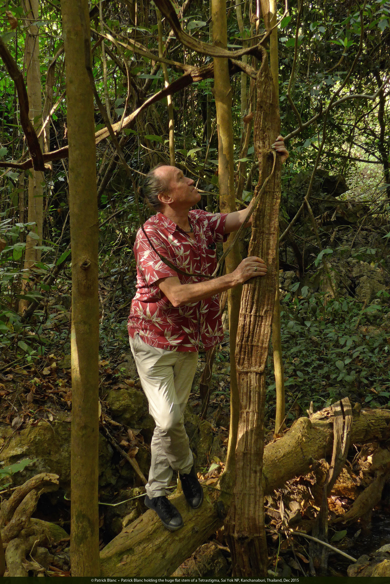 Patrick Blanc holding the huge flat stem of a Tetrastigma, Sai Yok NP, Kanchanaburi, Thailand, Dec 2015