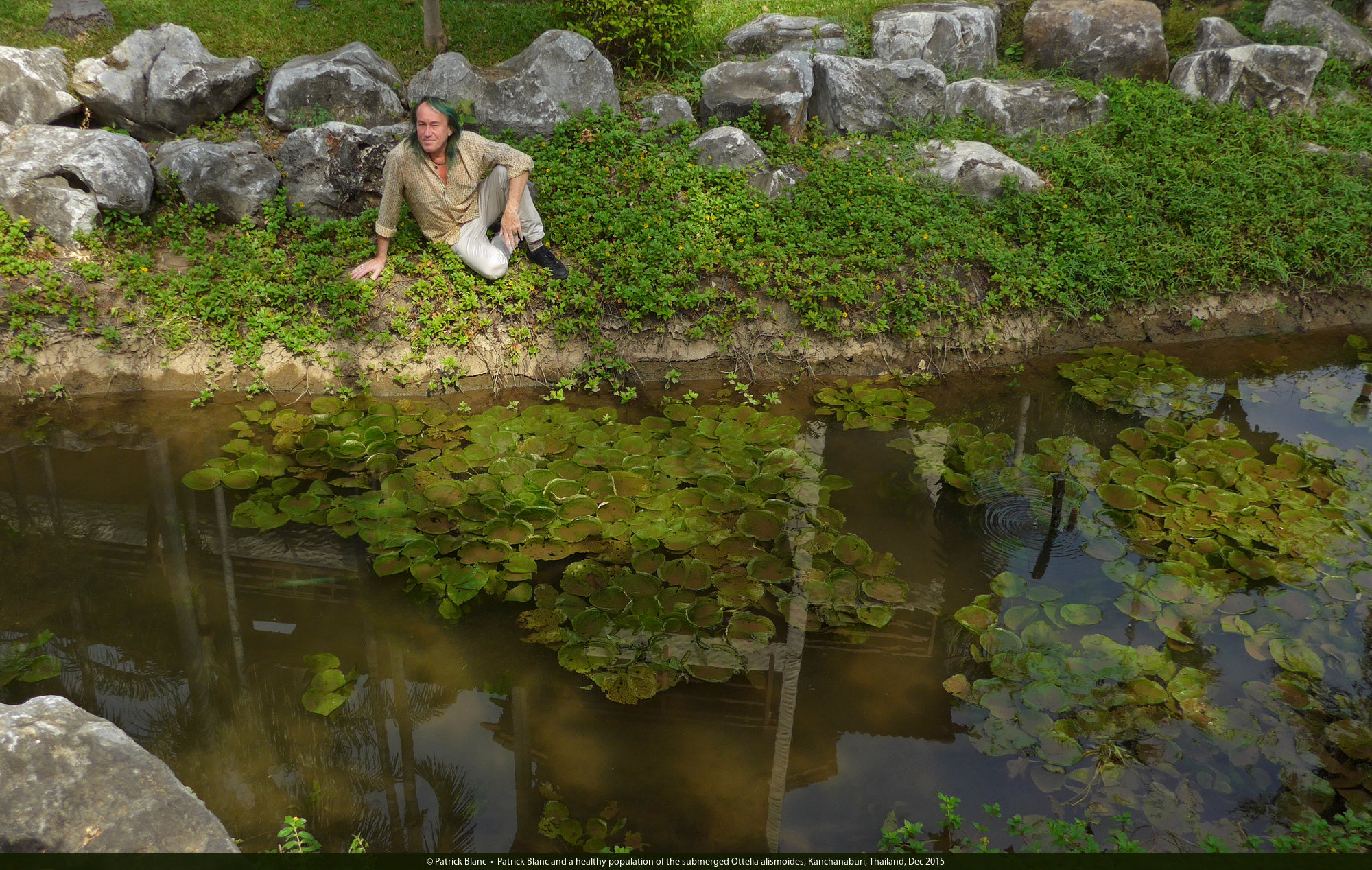 Patrick Blanc and a healthy population of the submerged Ottelia alismoides, Kanchanaburi, Thailand, Dec 2015