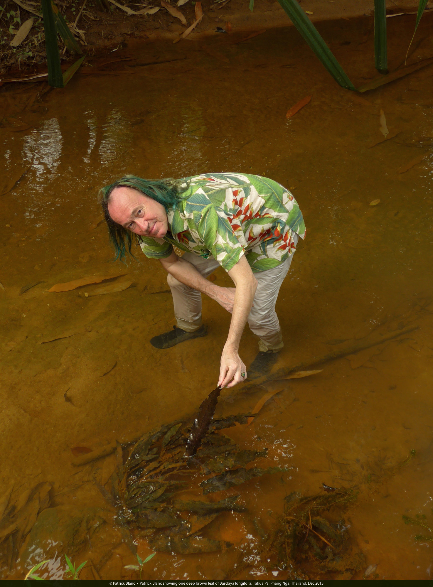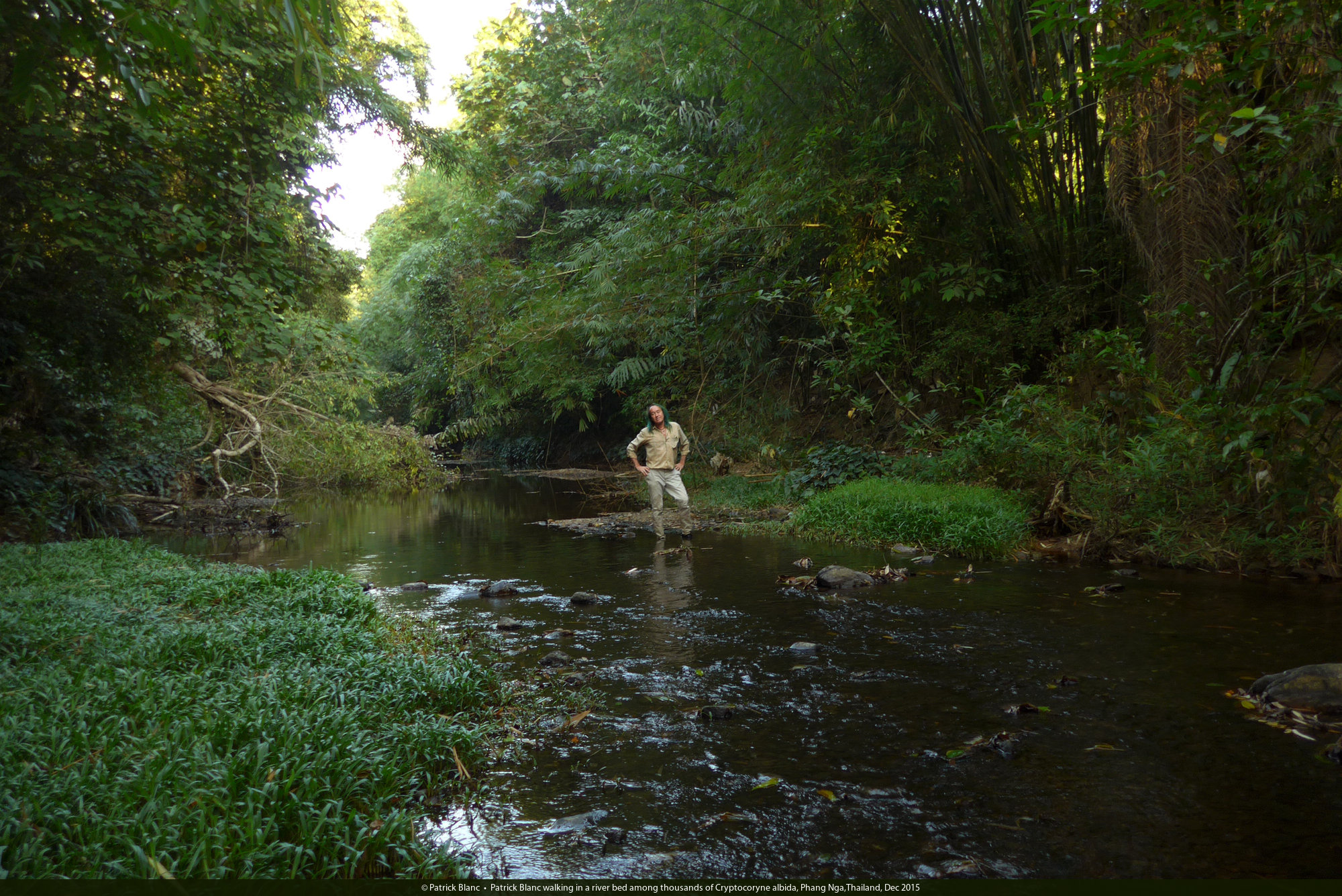 Patrick Blanc walking in a river bed among thousands of Cryptocoryne albida, Phang Nga,Thailand, Dec 2015