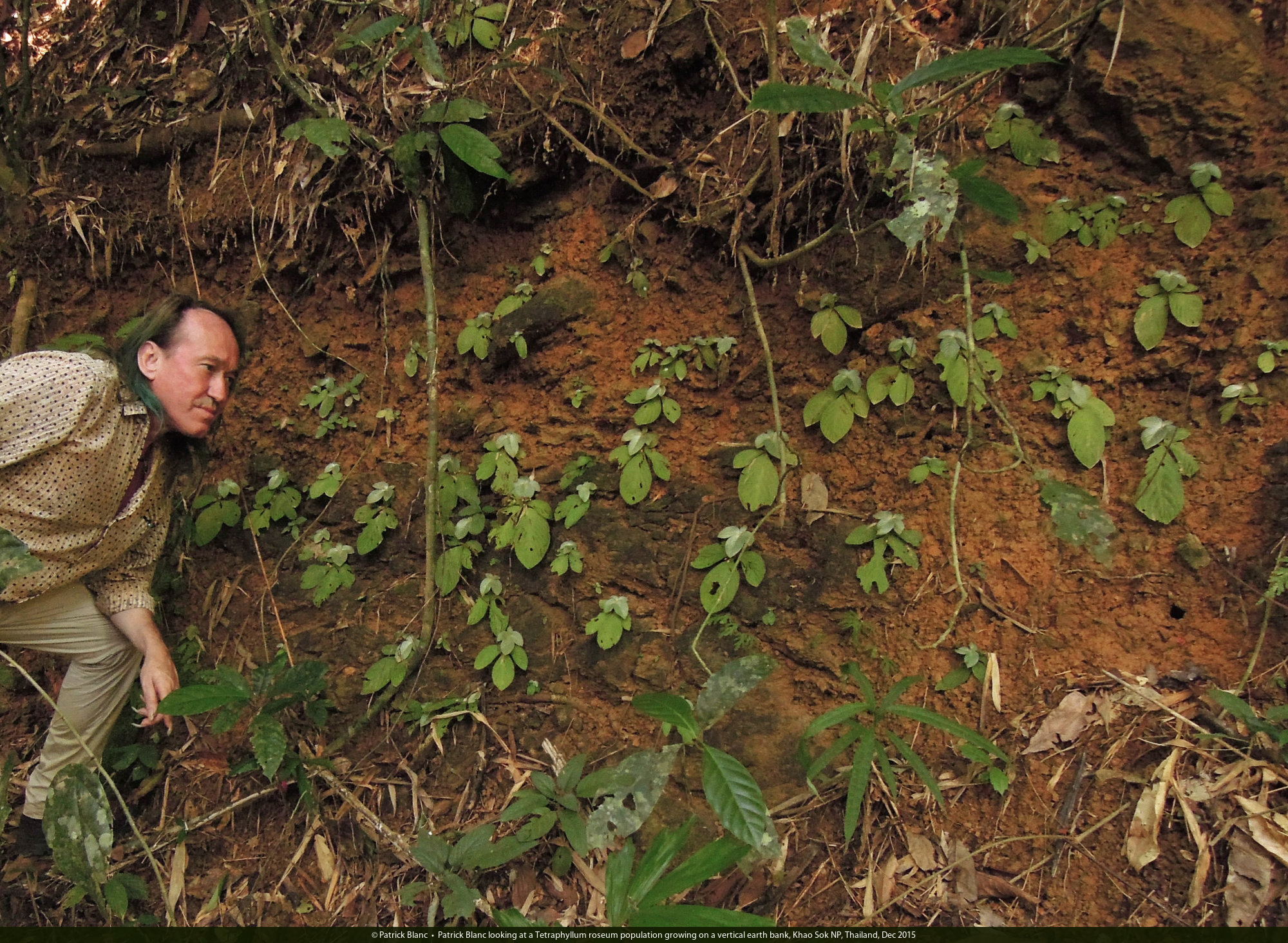 Patrick Blanc and a Tetraphyllum roseum population growing on a vertical earth bank, Khao Sok NP, Thailand, Dec 2015