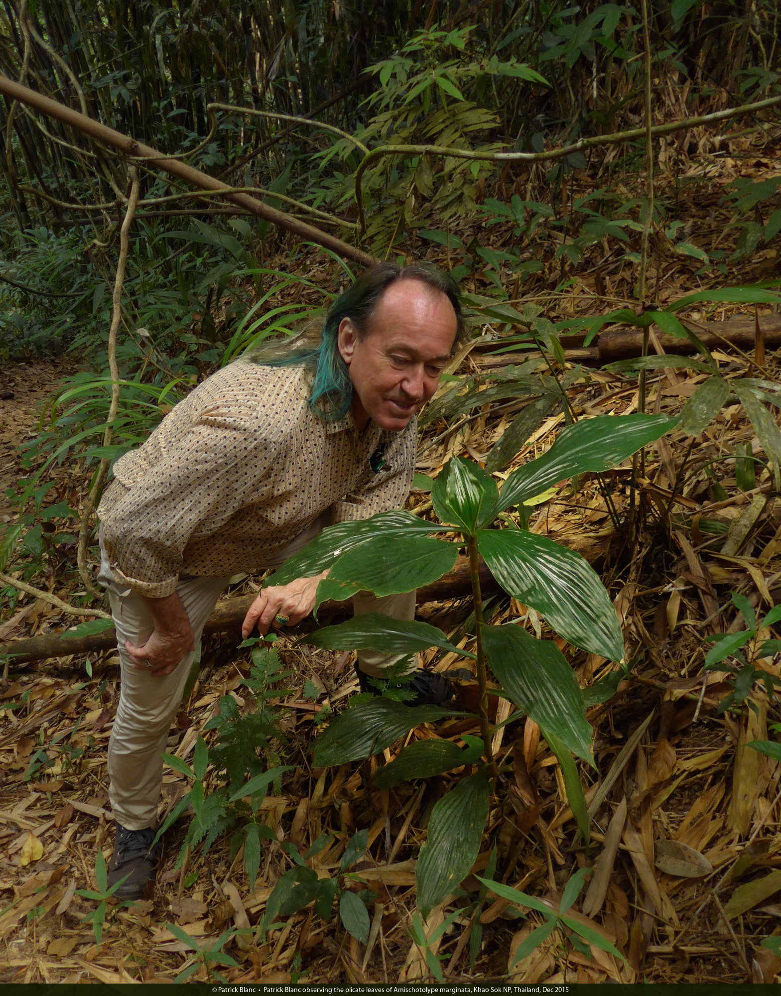 Patrick Blanc observing the plicate leaves of Amischotolype marginata, Khao Sok NP, Thailand, Dec 2015