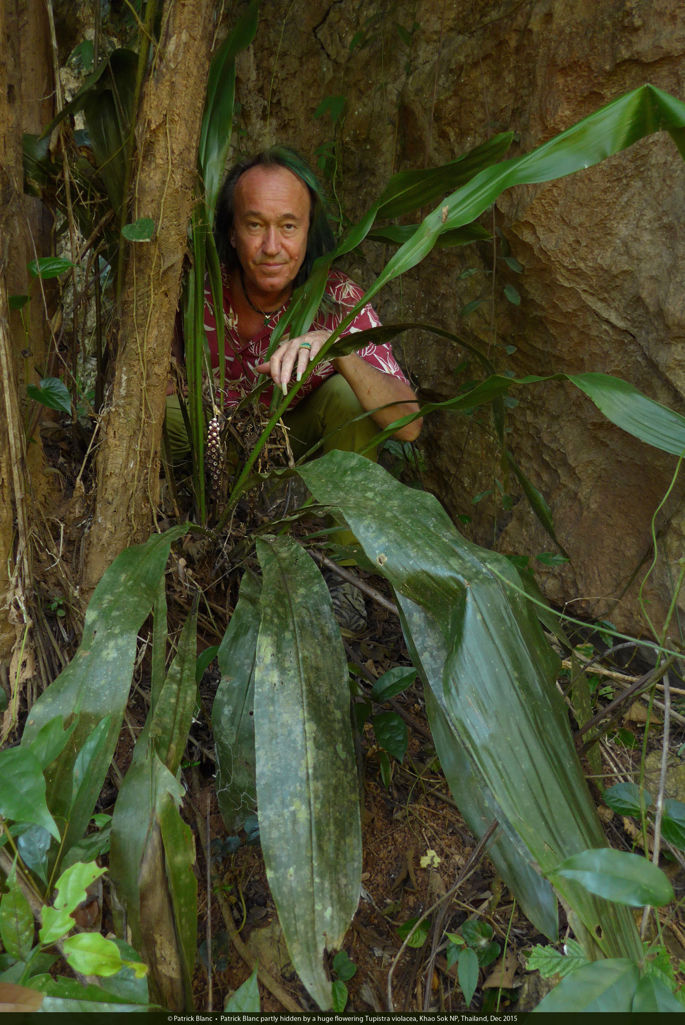 Patrick Blanc partly hidden by a huge flowering Tupistra violacea, Khao Sok NP, Thailand, Dec 2015