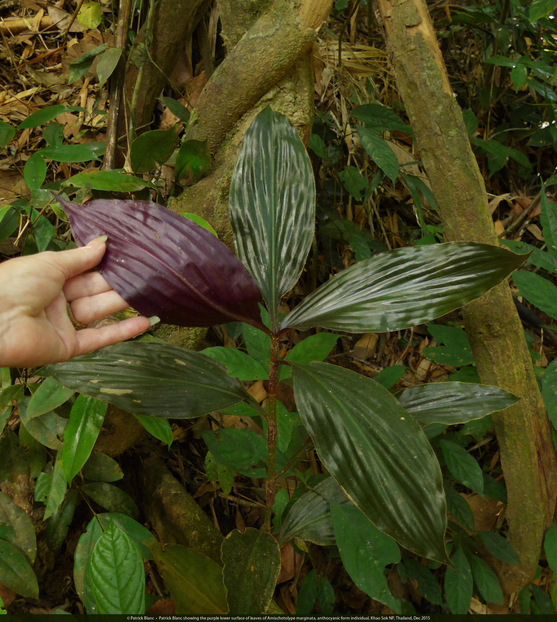 Patrick Blanc showing the purple lower surface of leaves of Amischotolype marginata, anthocyanic form individual, Khao Sok NP, Thailand, Dec 2015