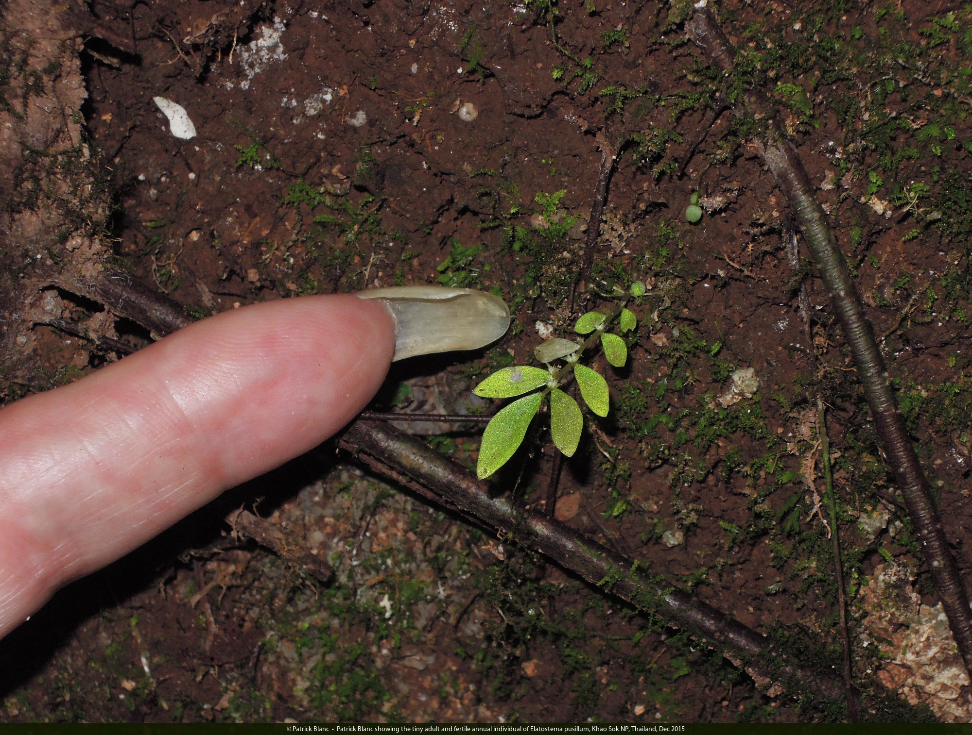 Patrick Blanc showing the tiny adult and fertile annual individual of Elatostema pusillum, Khao Sok NP, Thailand, Dec 2015