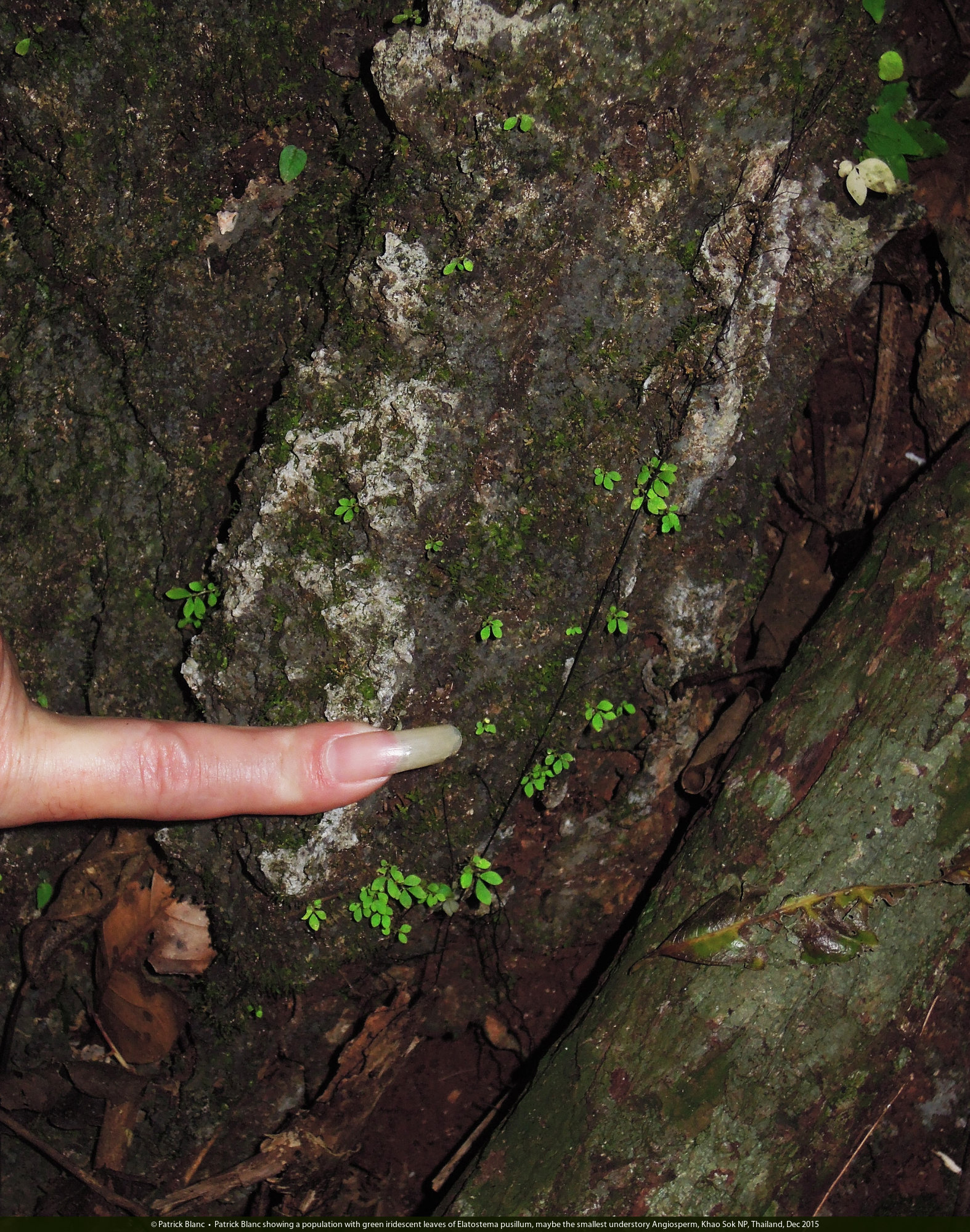Patrick Blanc showing a population with green iridescent leaves of Elatostema pusillum, maybe the smallest understory Angiosperm, Khao Sok NP, Thailand, Dec 2015