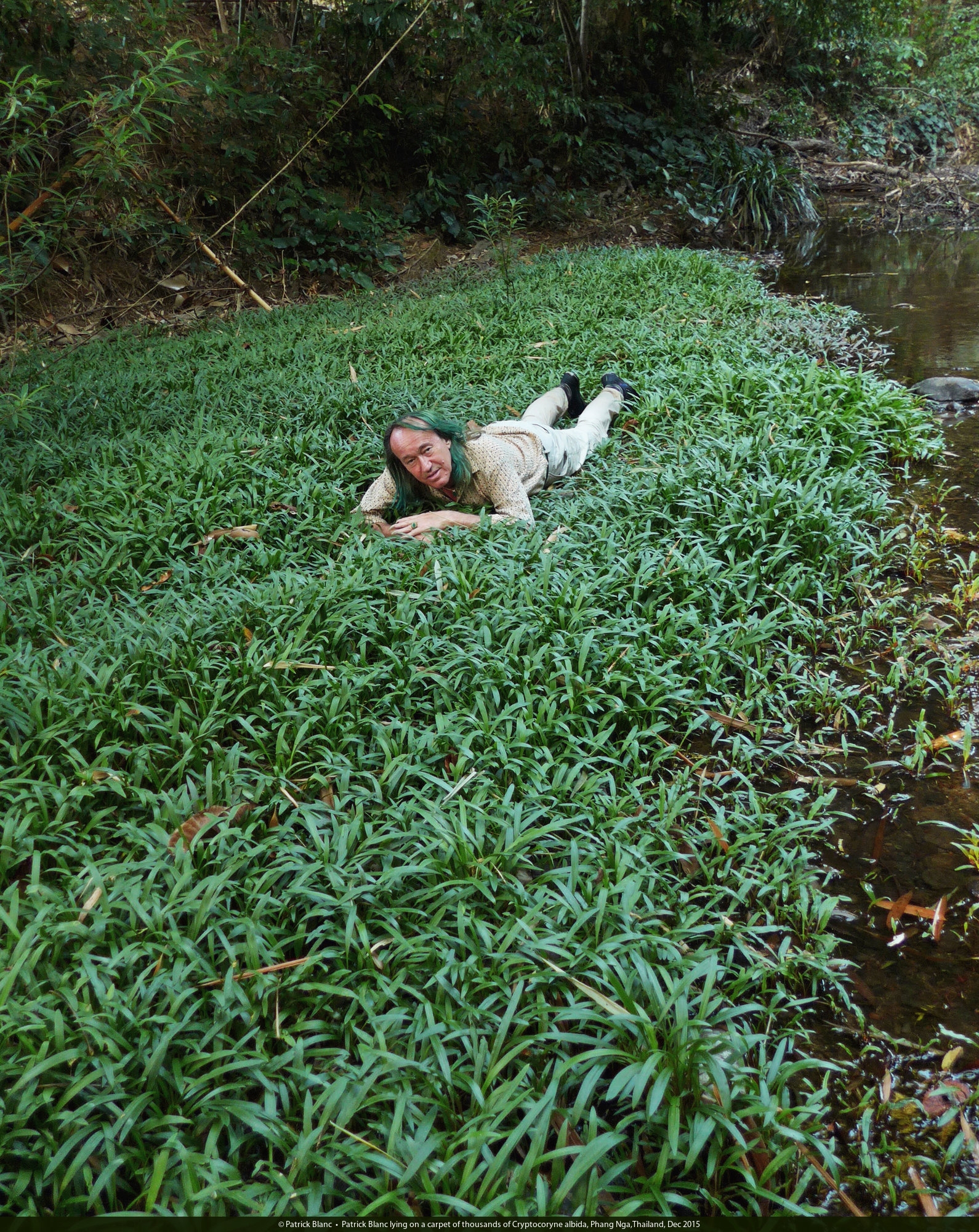 Patrick Blanc lying on a carpet of thousands of Cryptocoryne albida, Phang Nga,Thailand, Dec 2015