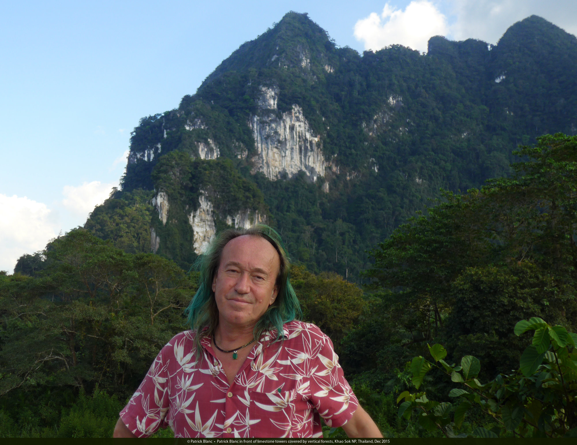 Patrick Blanc in front of limestone towers covered by vertical forests, Khao Sok NP, Thailand, Dec 2015
