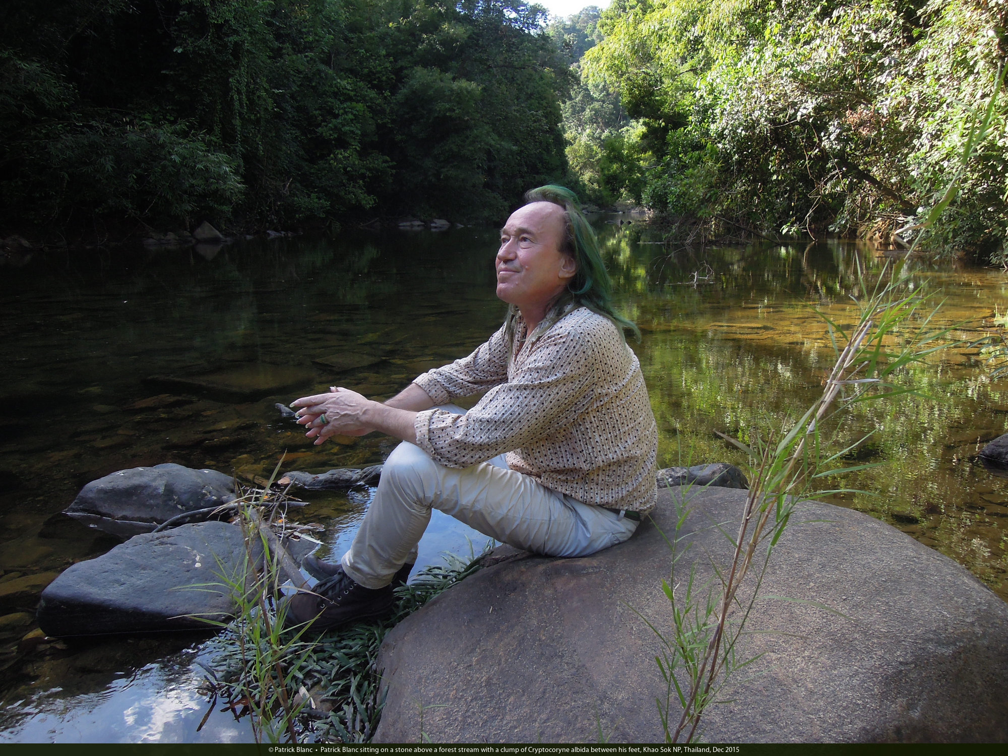 Patrick Blanc sitting on a stone above a forest stream with a clump of Cryptocoryne albida between his feet, Khao Sok NP, Thailand, Dec 2015