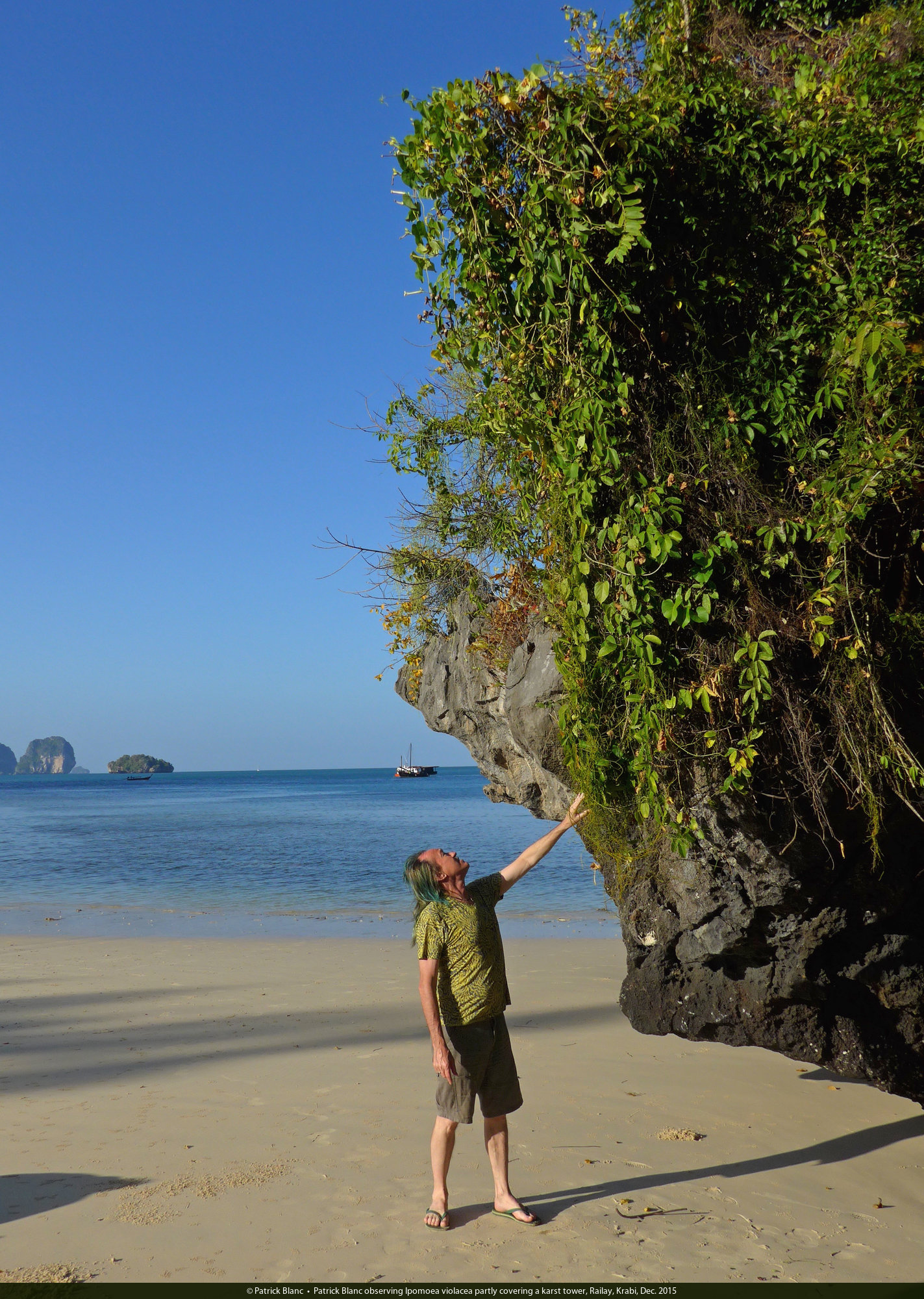 Patrick Blanc observing Ipomoea violacea partly covering a karst tower, Railay, Krabi, Dec. 2015