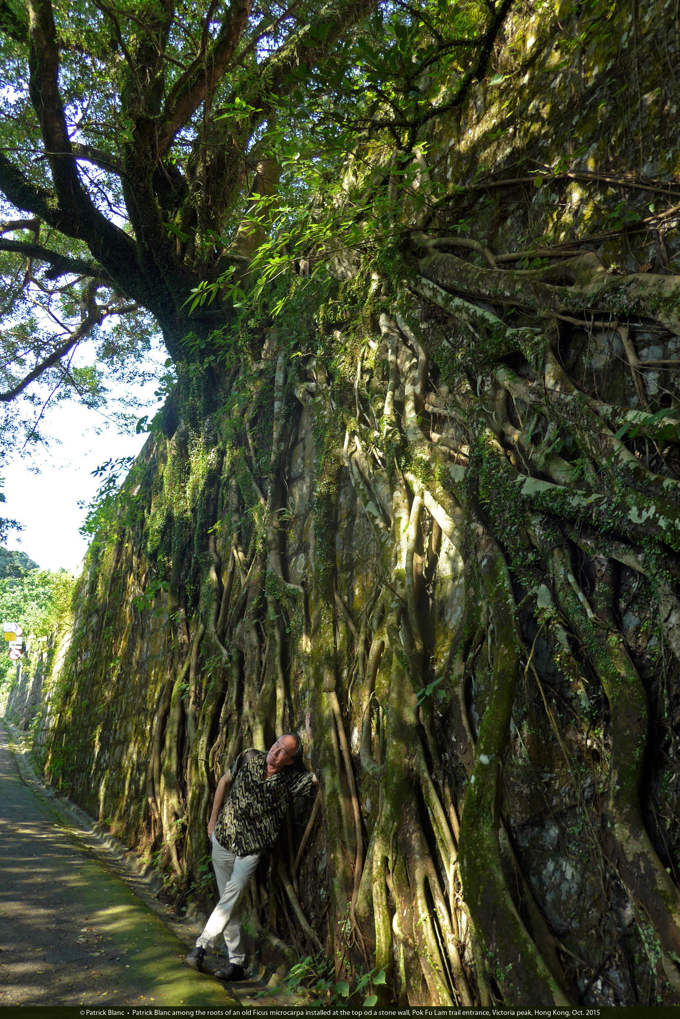 Patrick Blanc among the roots of an old Ficus microcarpa installed at the top od a stone wall, Pok Fu Lam trail entrance, Victoria peak, Hong Kong, Oct. 2015