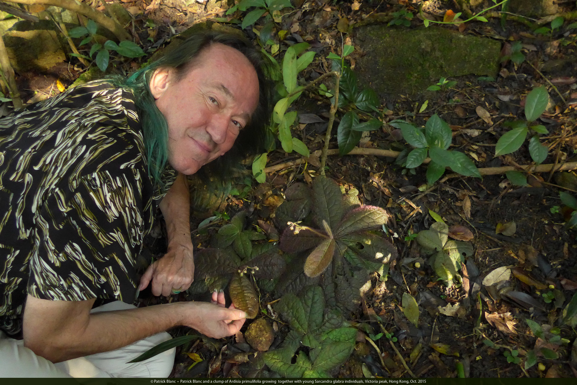 Patrick Blanc and a clump of Ardisia primulifolia growing together with young Sarcandra glabra individuals, Victoria peak, Hong Kong, Oct. 2015