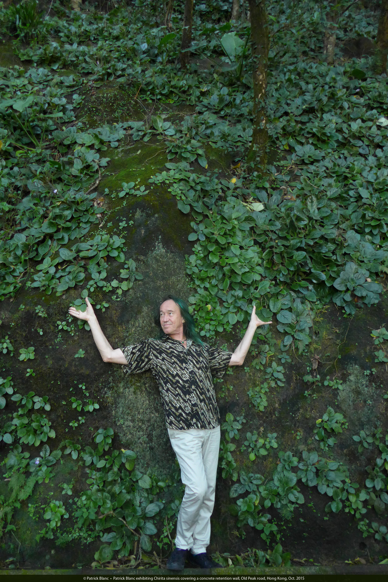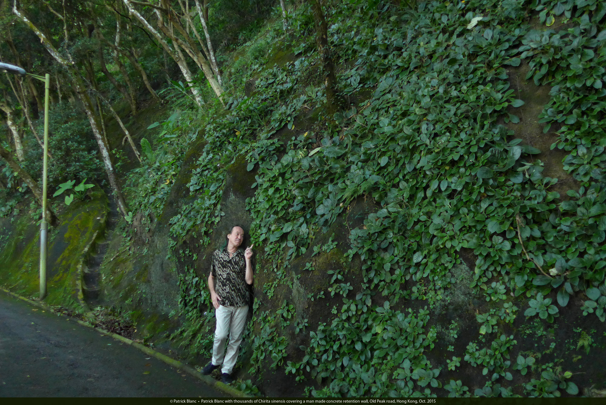 Patrick Blanc exhibiting Chirita sinensis covering a concrete retention wall, Old Peak road, Hong Kong, Oct. 2015