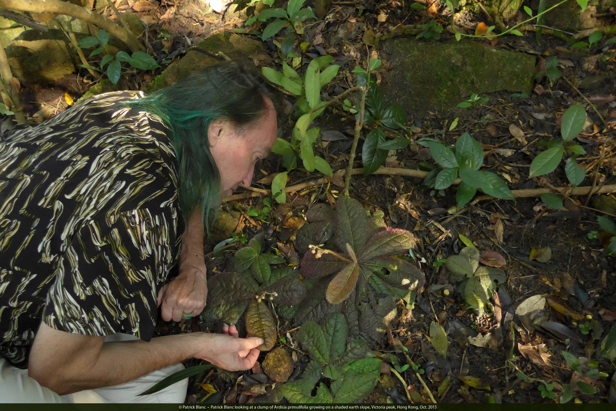 Patrick Blanc looking at a clump of Ardisia primulifolia growing on a shaded earth slope, Victoria peak, Hong Kong, Oct. 2015