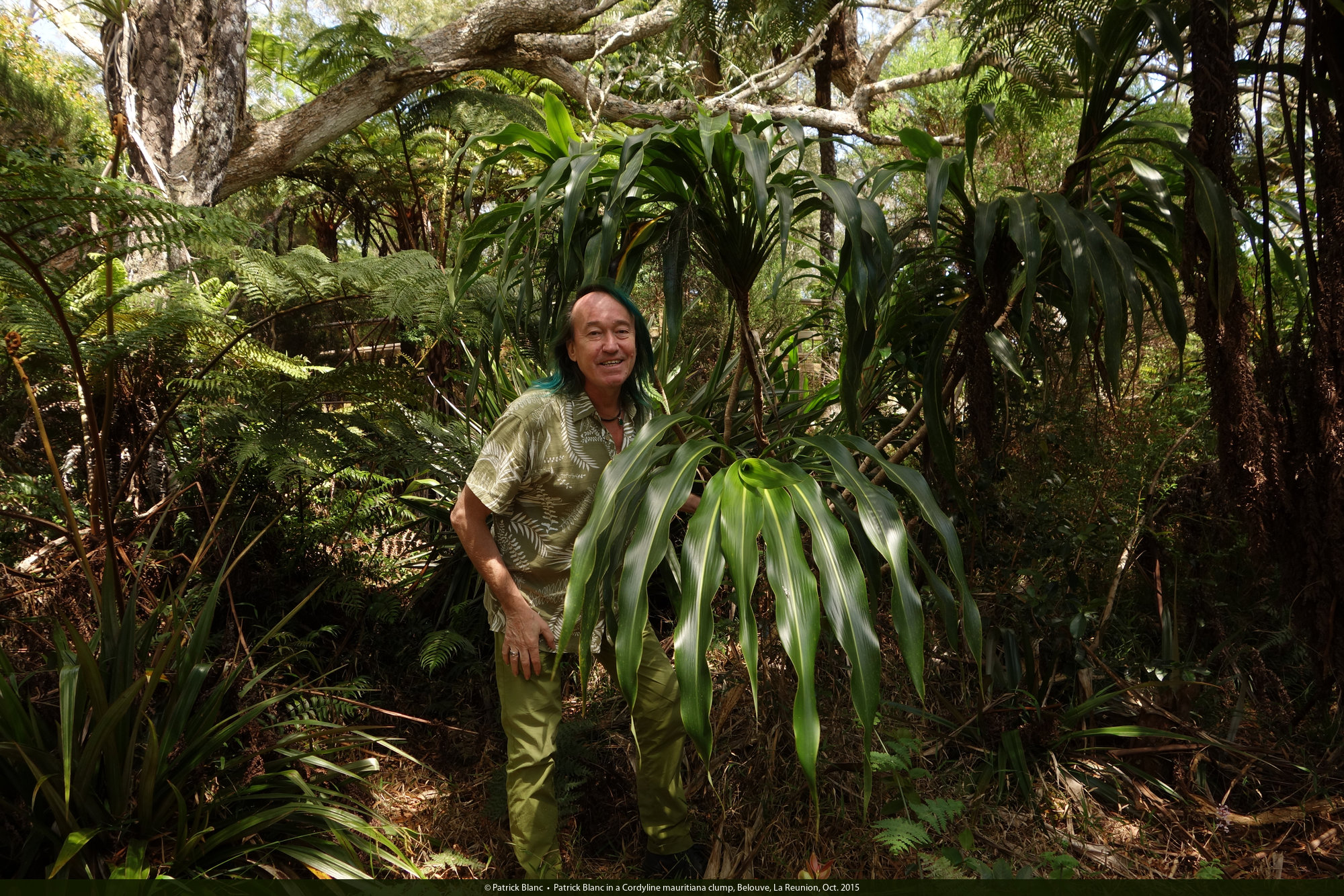 Patrick Blanc in a Cordyline mauritiana clump, Belouve, La Reunion, Oct. 2015
