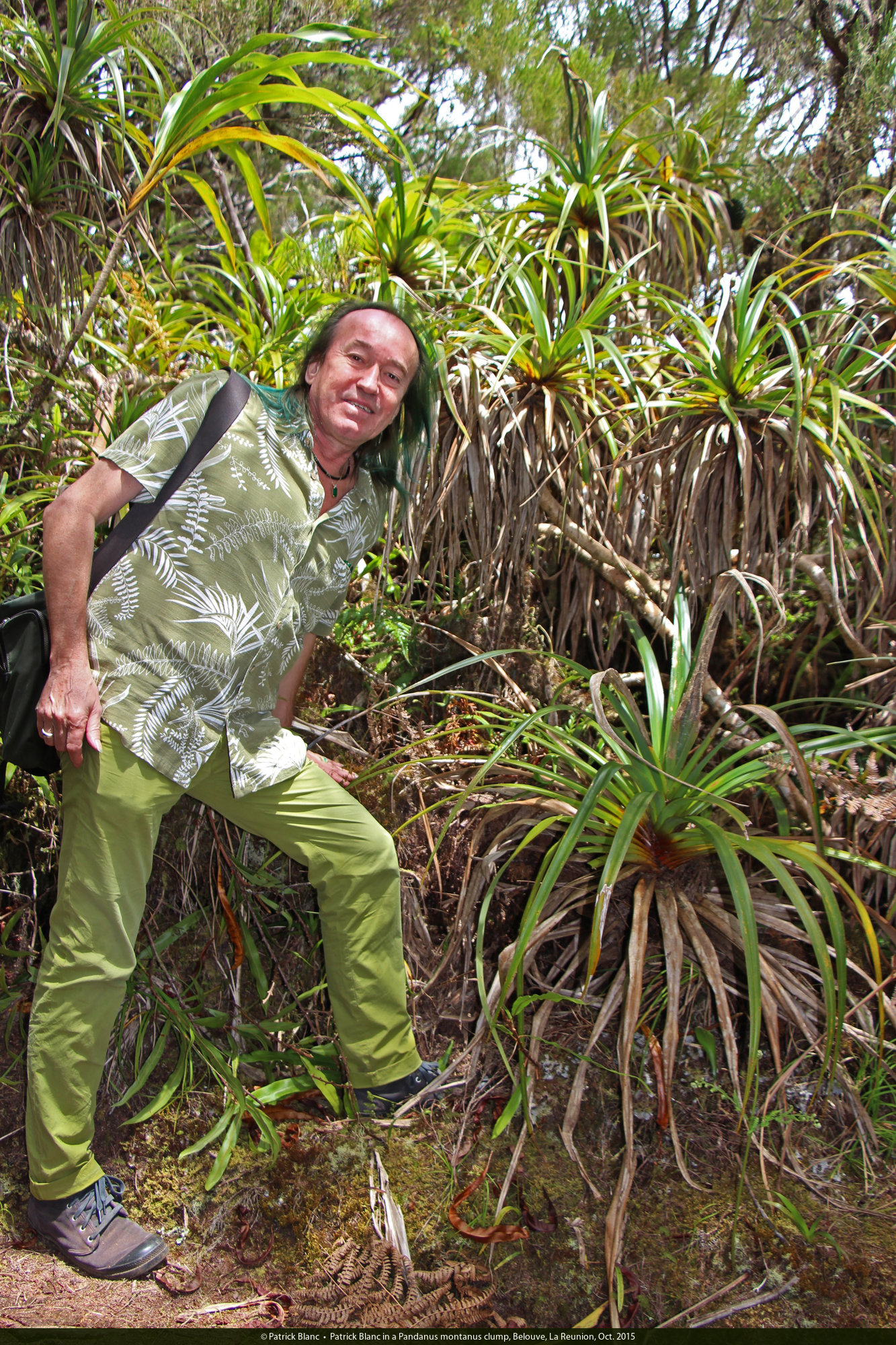 Patrick Blanc in a Pandanus montanus clump, Belouve, La Reunion, Oct. 2015